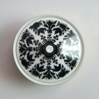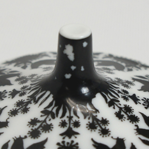 このアイテムは、白い磁器肌にコッパーを載せ、墨一色で鳥と草花を描いたウィンブラッドの絵付けによる極めてエレガントなデザイン。