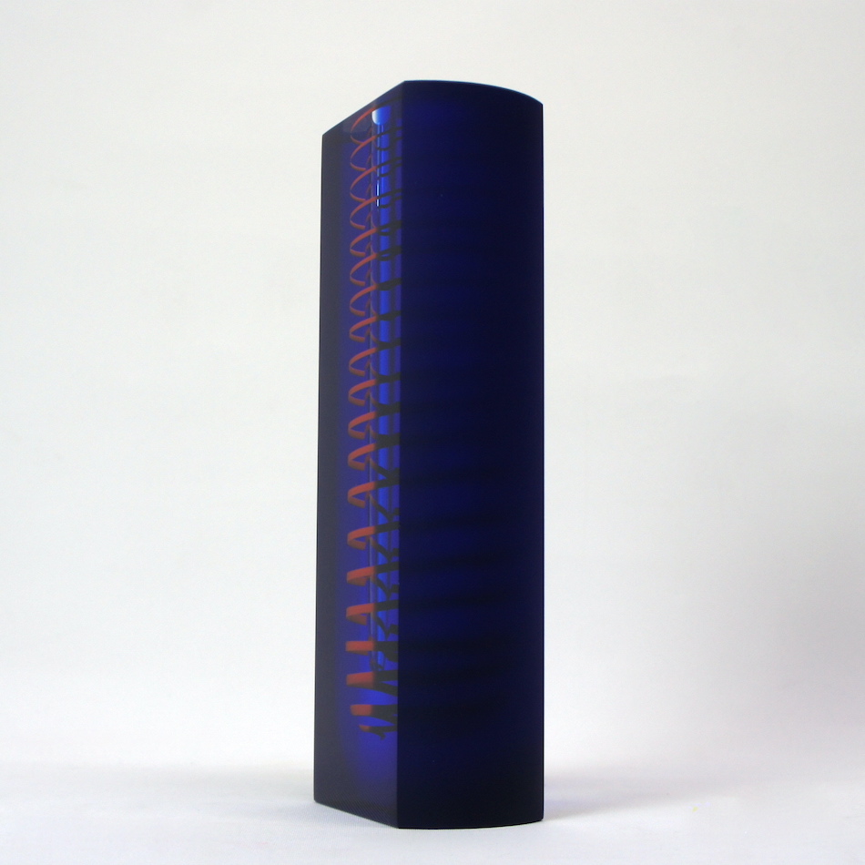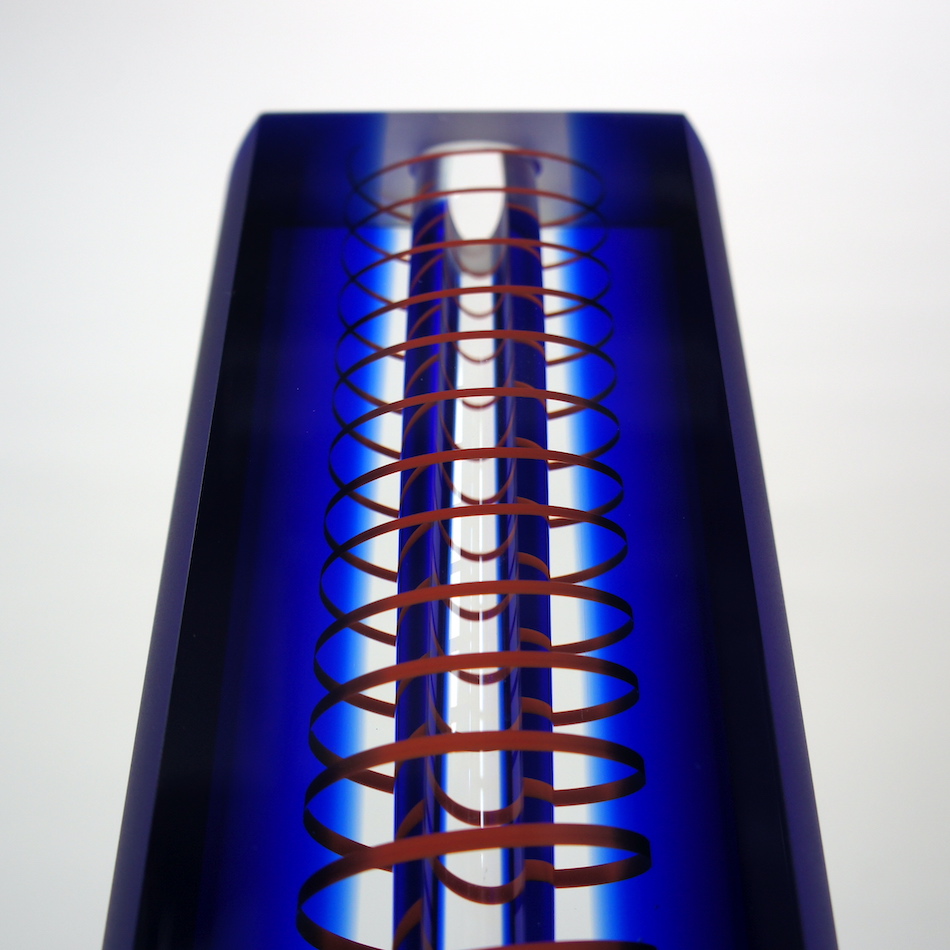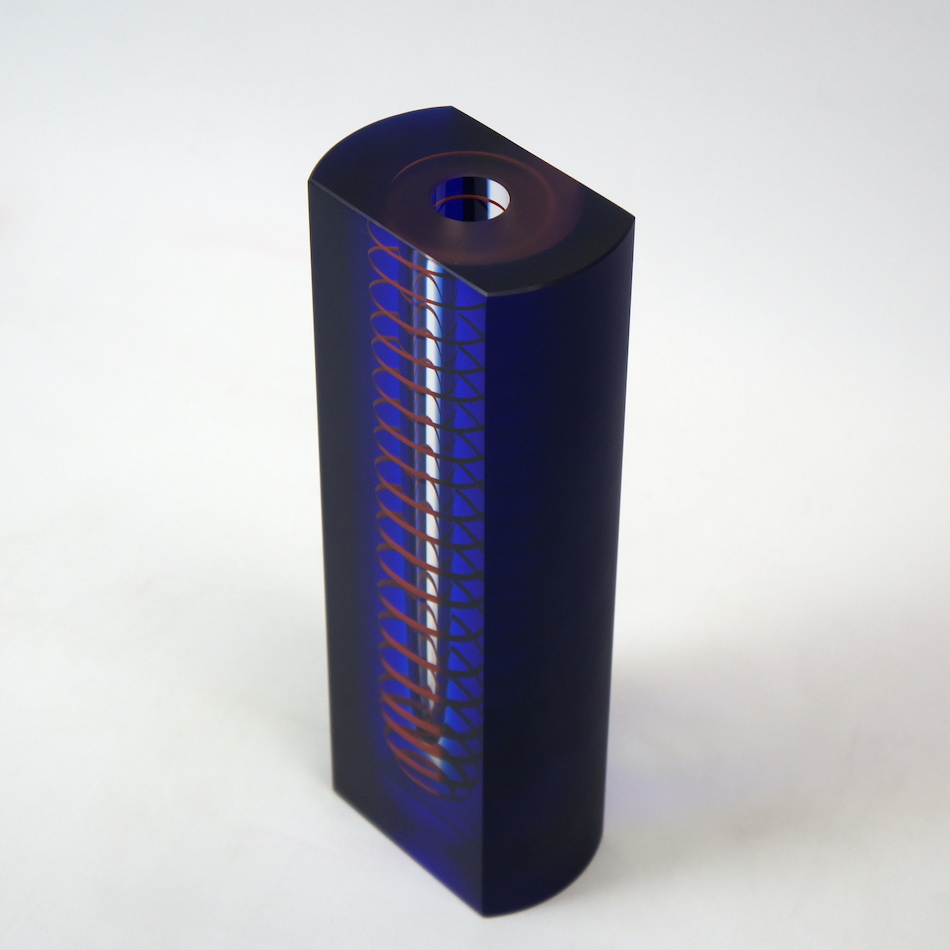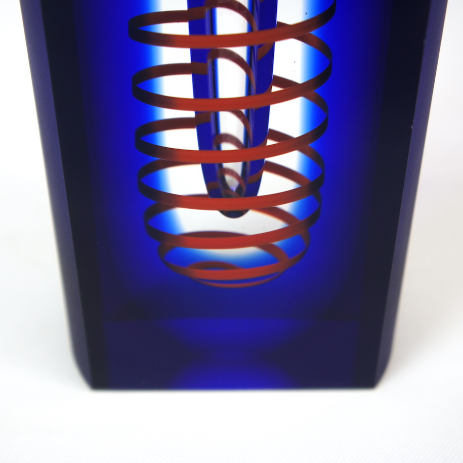 70年代にチェコのBeranek工房より発表された本作品は、ガラス表現とは思えない超絶技巧を駆使し、群青のグラデーションの中に美しい螺旋装飾を閉じ込めた神秘的なデザイン。その景色は、小さなガラスの中にもかかわらず無限の宇宙がそこに存在しているかの様。