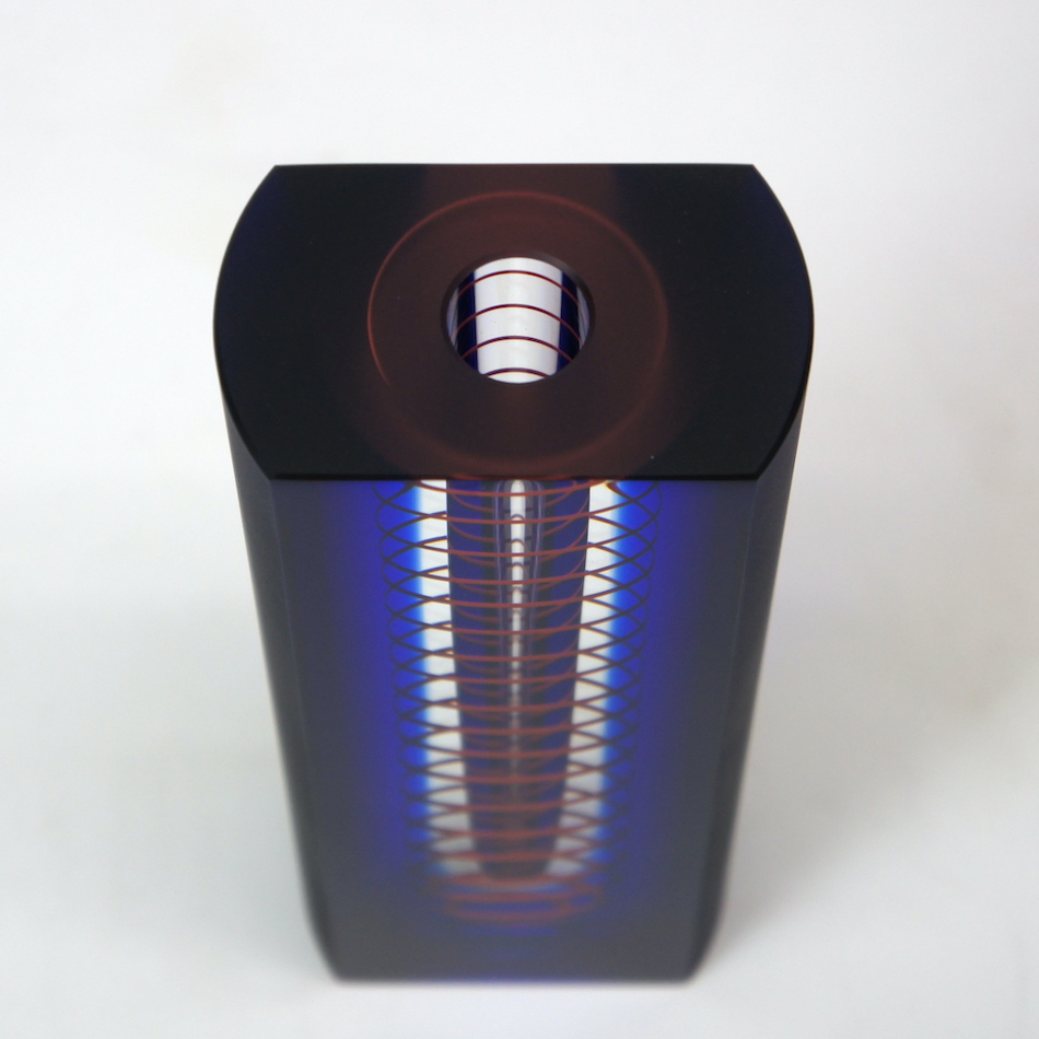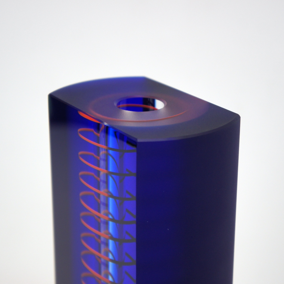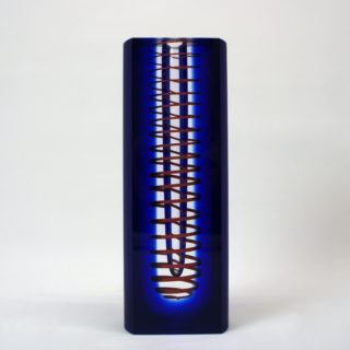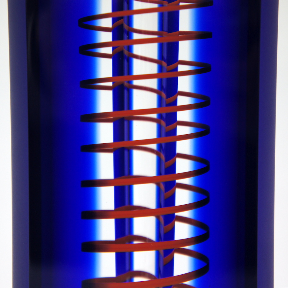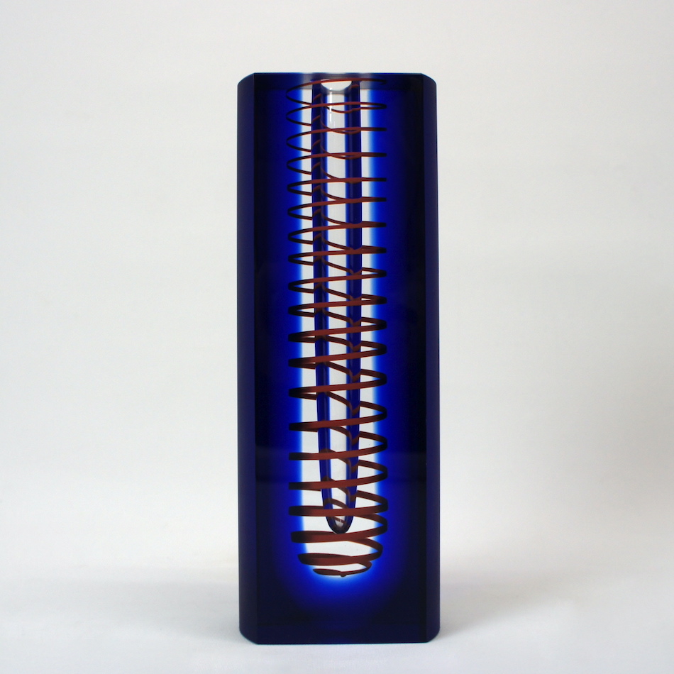 70年代にチェコのBeranek工房より発表された本作品は、ガラス表現とは思えない超絶技巧を駆使し、群青のグラデーションの中に美しい螺旋装飾を閉じ込めた神秘的なデザイン。その景色は、小さなガラスの中にもかかわらず無限の宇宙がそこに存在しているかの様。