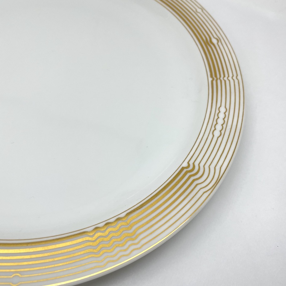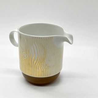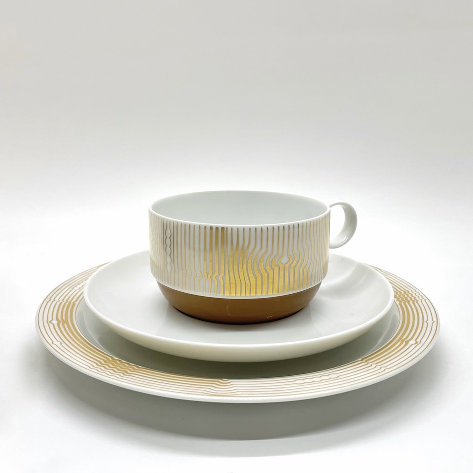 ゴールド一色で描かれた”Vasarely” デザイン特有の幾何学グラフィックが”Pozzi”デザインの丸みを帯びたポット、カップ、クリーマー、ケーキプレートの周囲を取り巻く様に描かれたデザインはモダン且つエレガント。