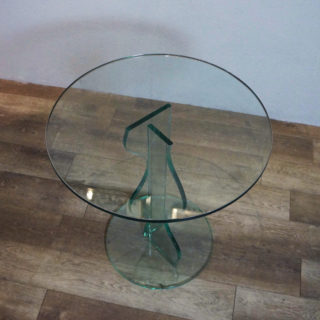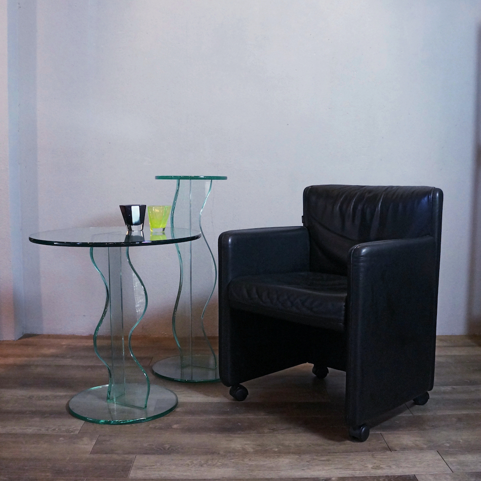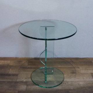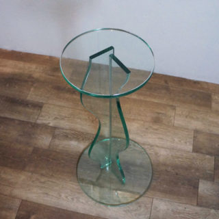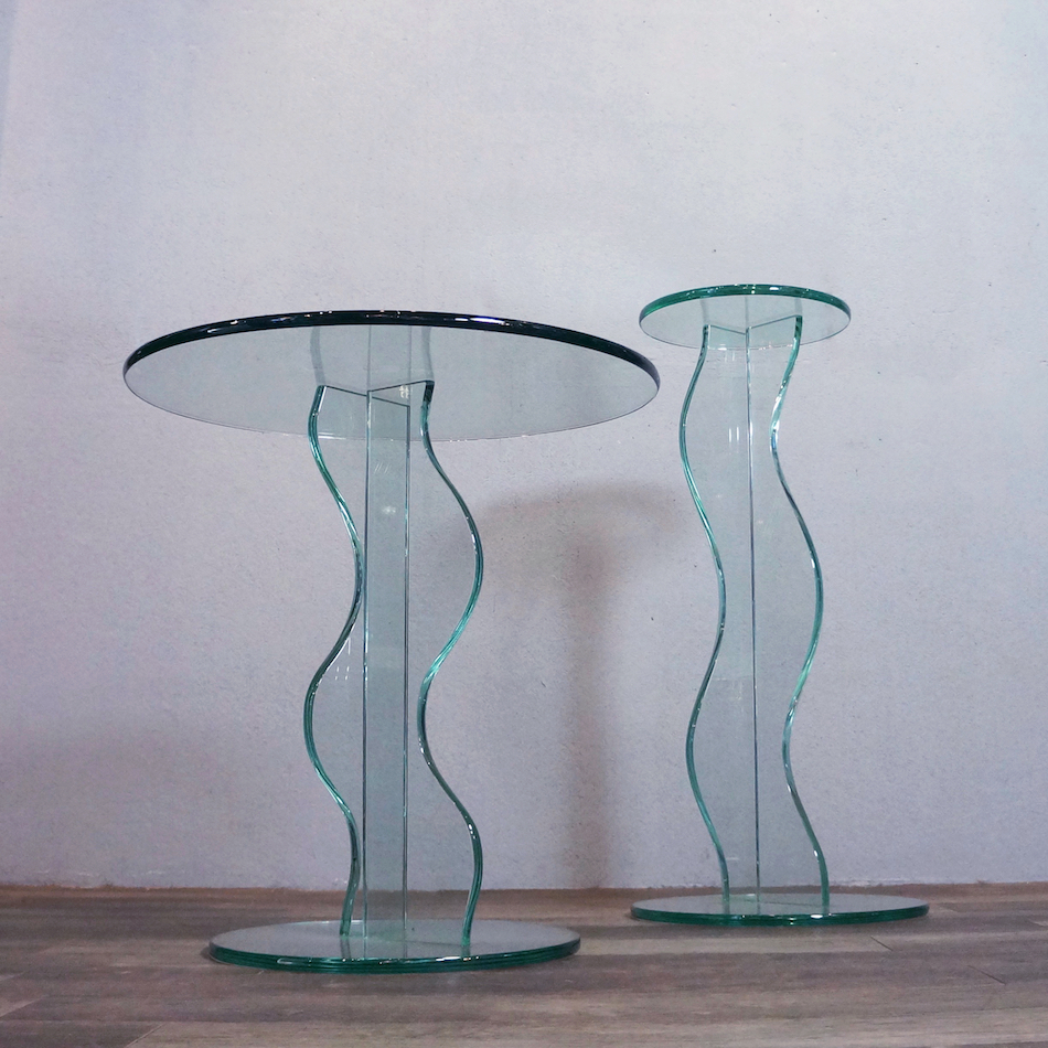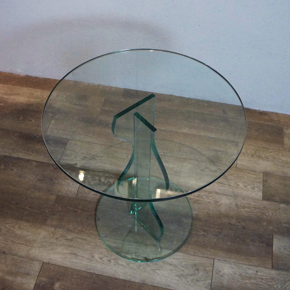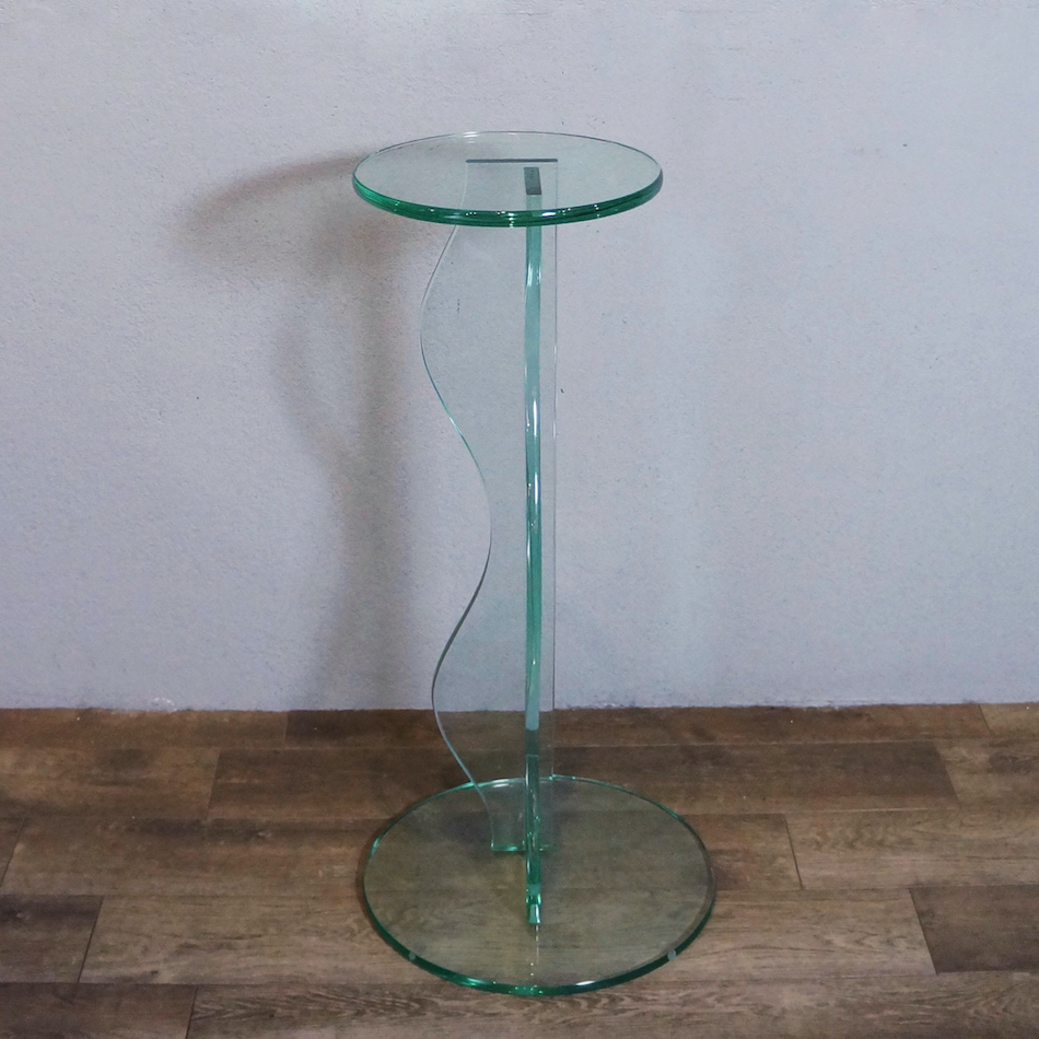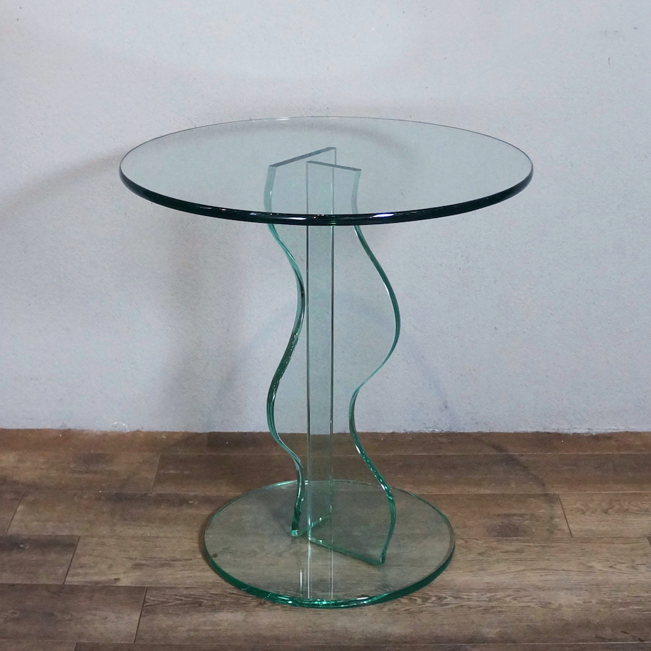 ポストモダンデザイン的を象徴する波打つ支柱を持つ総ガラス製アートテーブル。