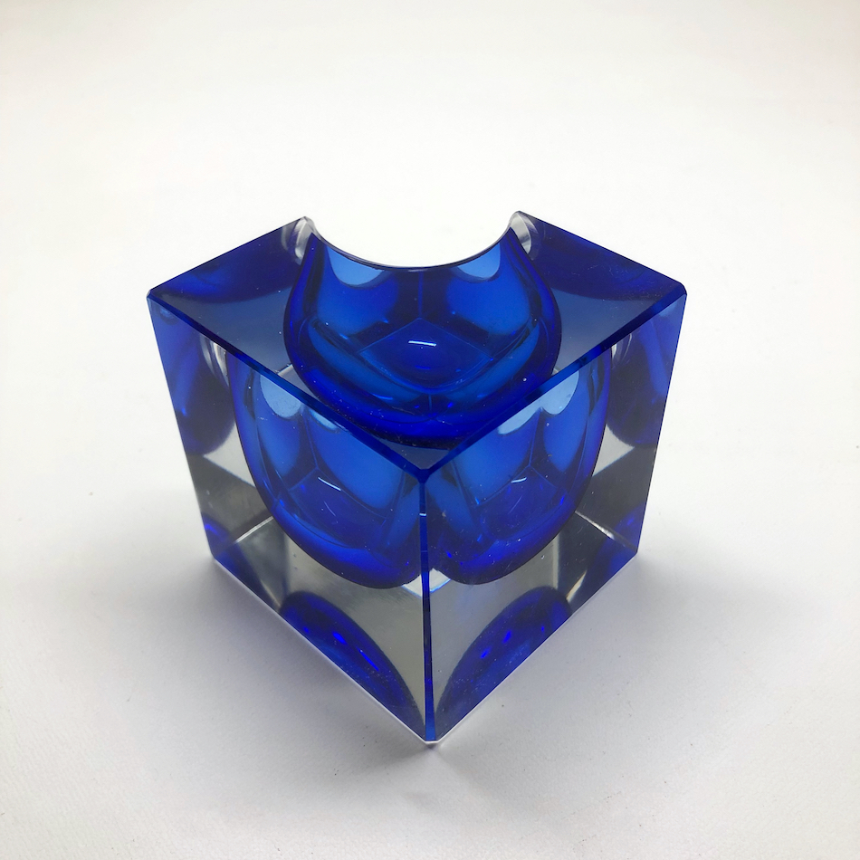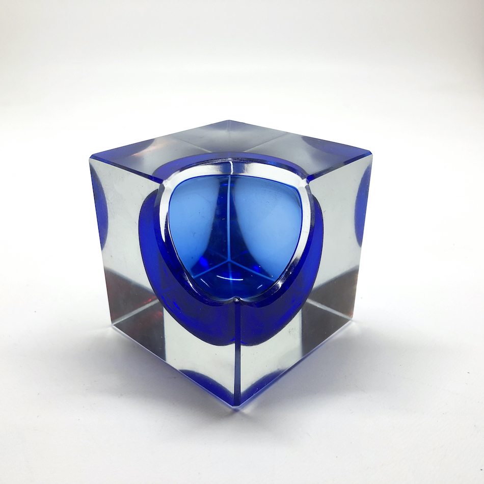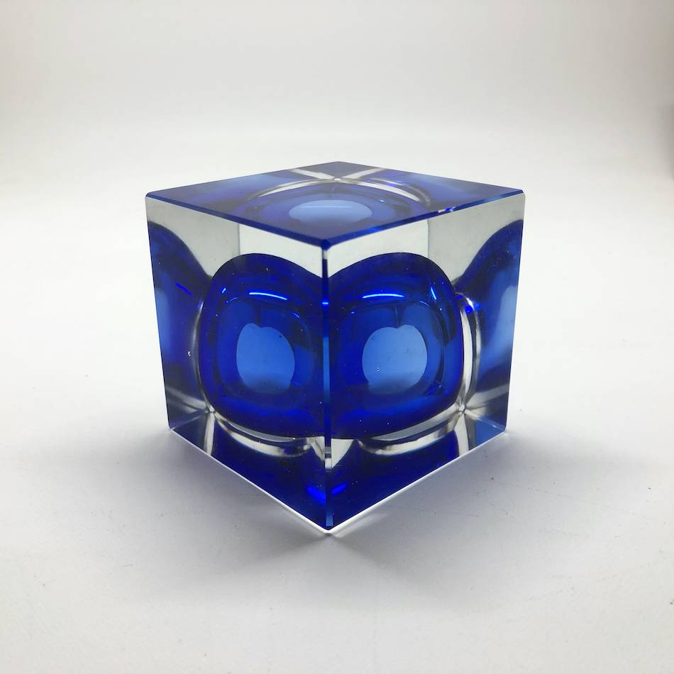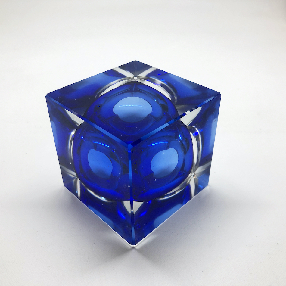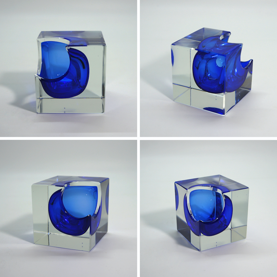 キューブ状のガラスの一角を大きく丸く刳り貫いた不思議なフォルムのスカルプチャー。