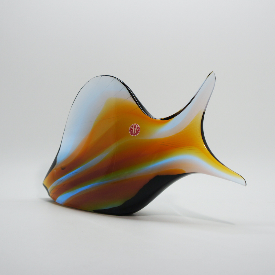 まるで水を得た魚のように艶やかなチェコガラスの透明度に、ブルーとアンバーがボーダーに入ったトロピカルフィッシュ。この色彩に魅了された愛好家が世界中に存在するコレクター・アイテムです。