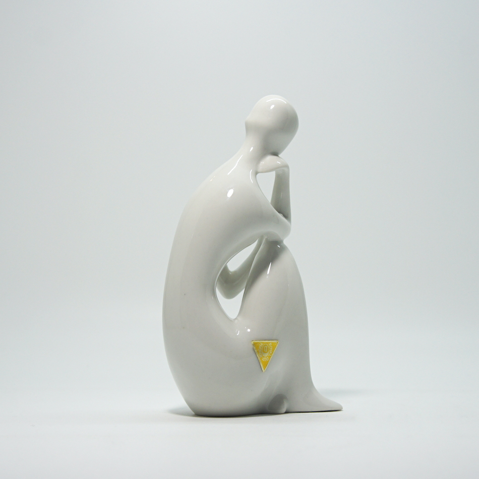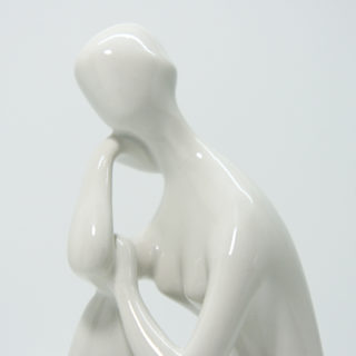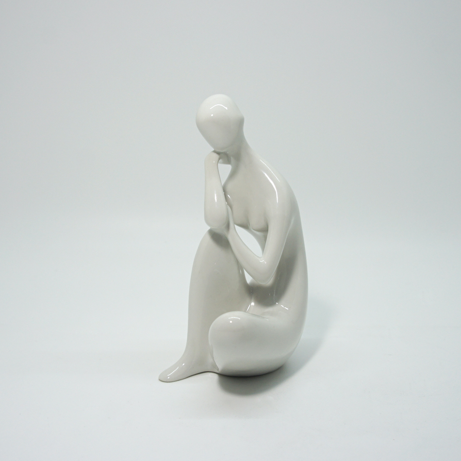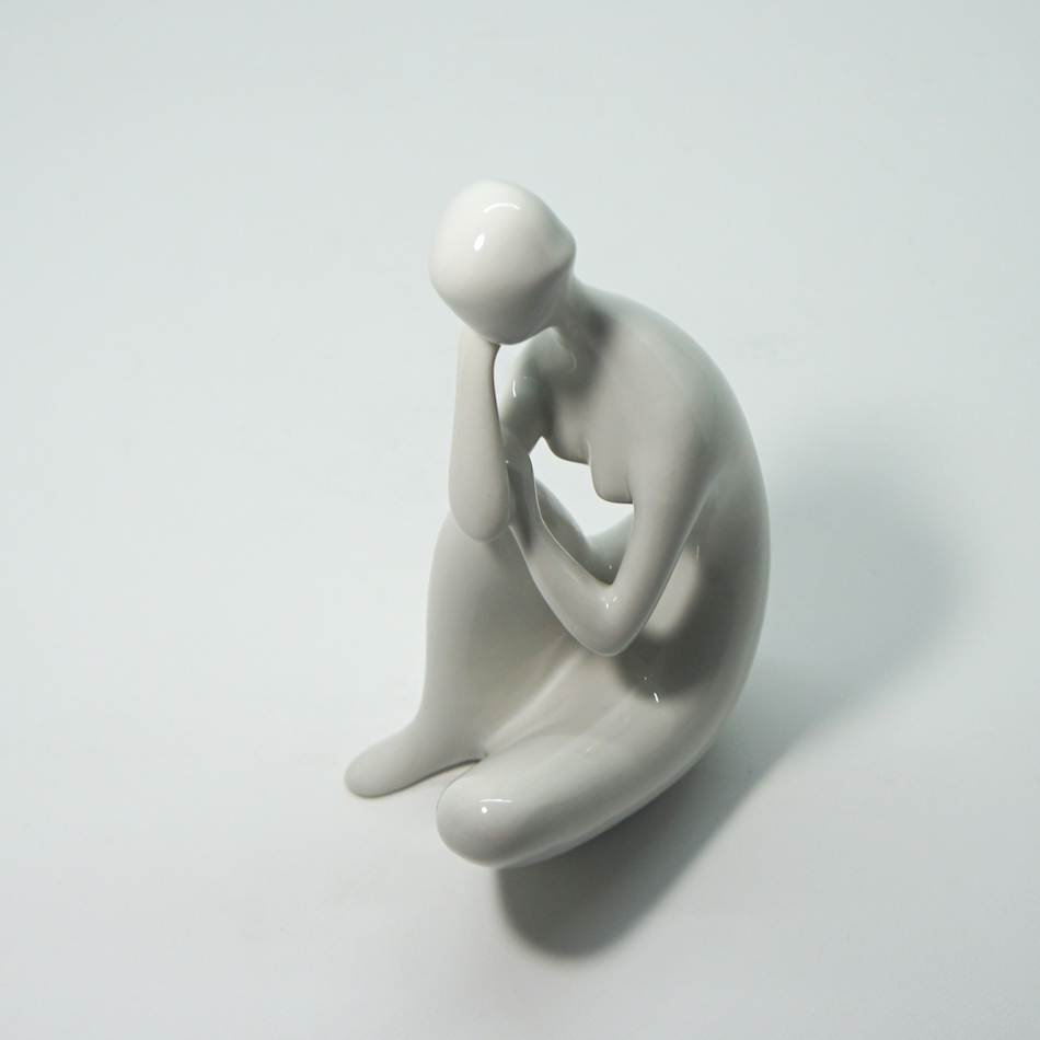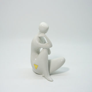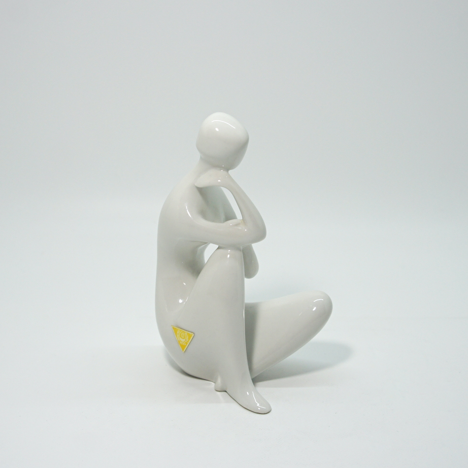 肉感的ながら華麗さも併せ持つフォルム。考え込むように座る女性がミニマルに表現された繊細な抽象彫刻のような作品。白一色の磁器表面の陰影やハイライトが美しいコントラストを生み、造形美をよりいっそう際立たせます。