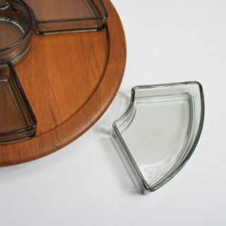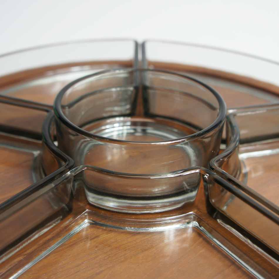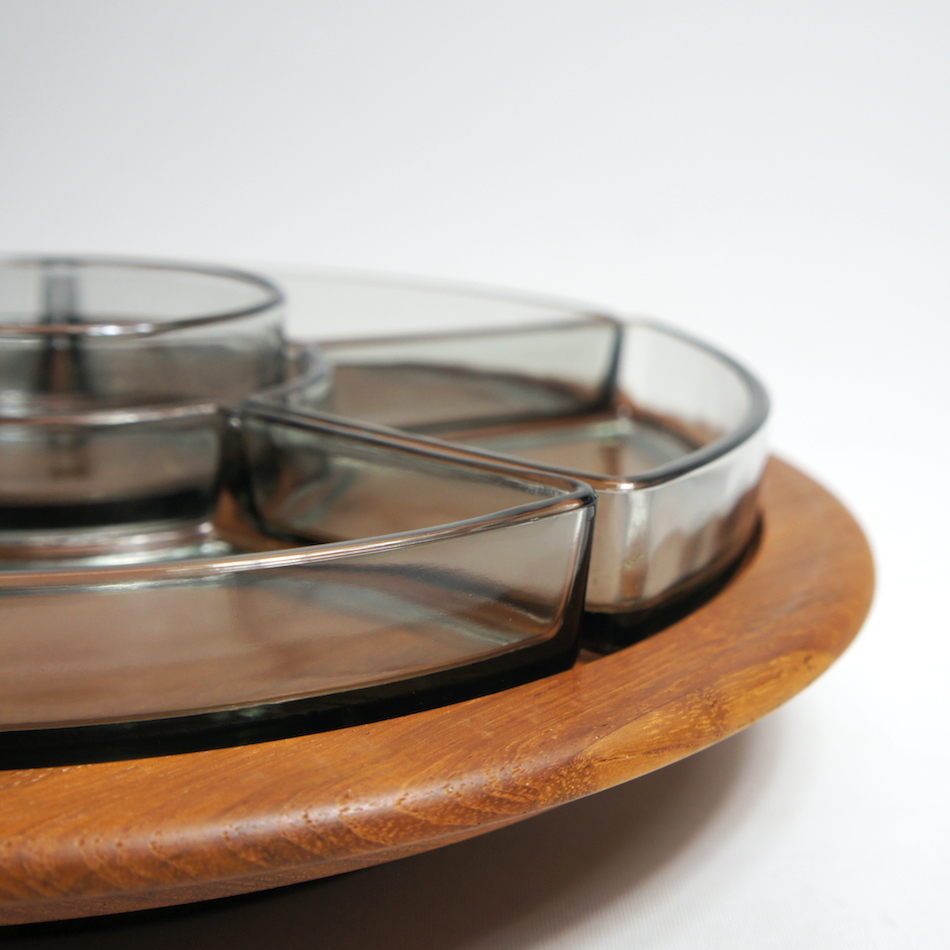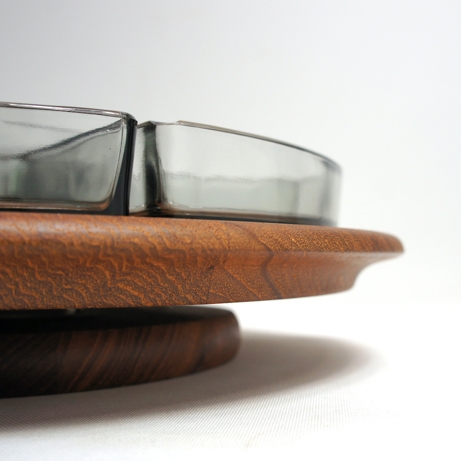 チーク無垢集成削り出しの板が、上下からベアリングをサンド。エッジの削りだしはソフトで精度が高く、技術の高さを感じさせます。円形のガラスのトレーを中央に取り囲むように周囲に扇形の五つのガラスのトレーを配置、スモークガラスとチークの相性ha抜群です。