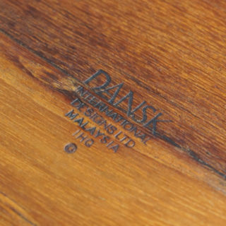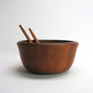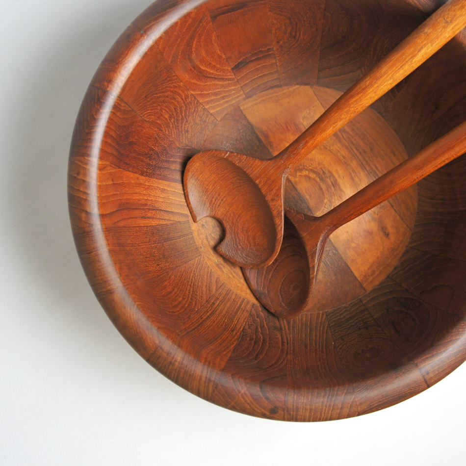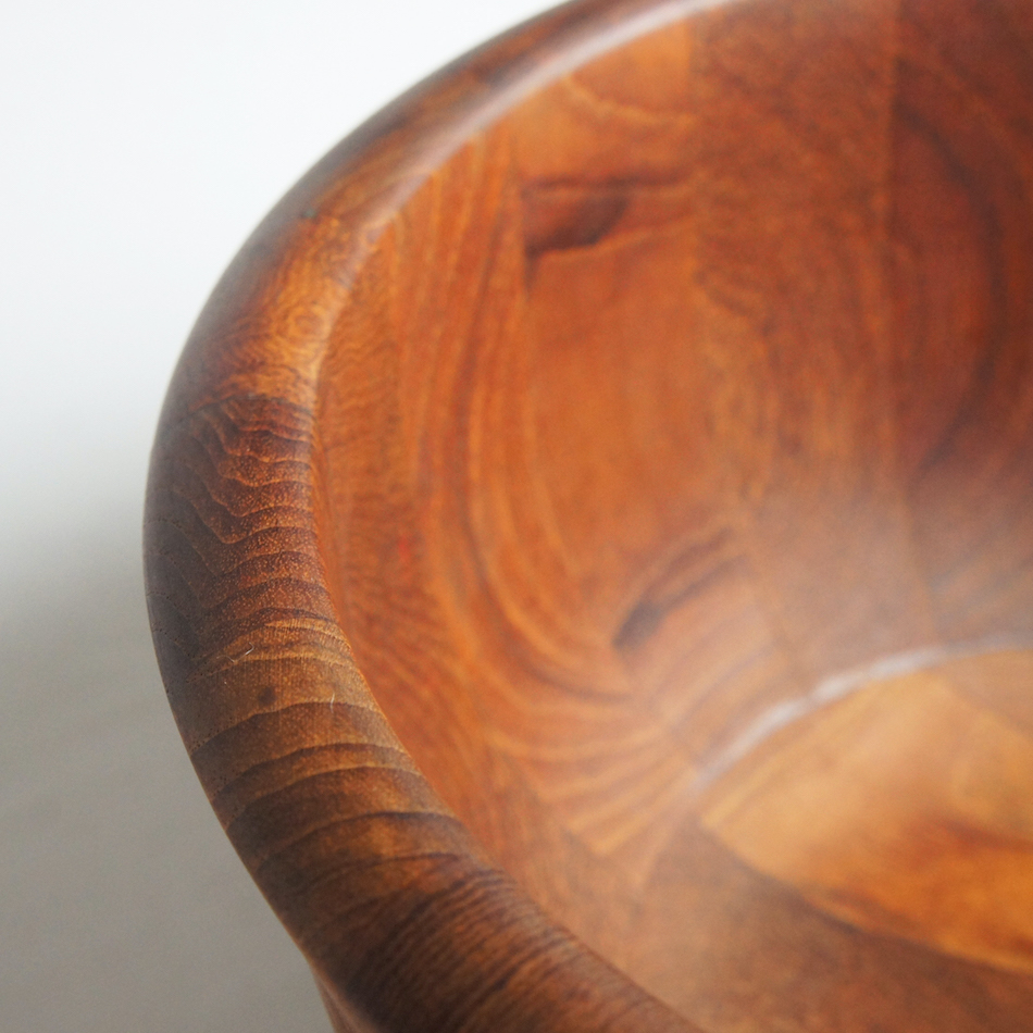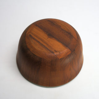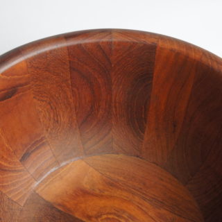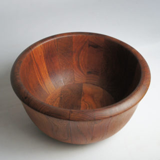 入れた野菜が均等に分散するように見込みの中央をドーム状に少し盛り上げ、淵の部分をわずかに広がるように削り出して持ち易くする、などユーザビリティーに配慮したフォルムデザイン。数ある”ダンスクJHQ”デザインのチークボウルの中でも秀逸なアイテム。円状に割り付け集成したチークの木目による豊かな表情も大きな魅力です。