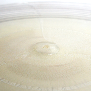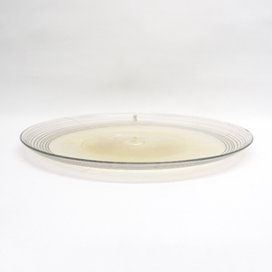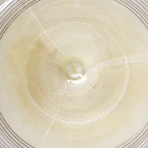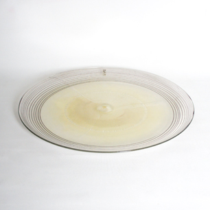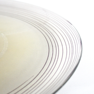 直径約40cm、厚さ3mm程、薄くて大きなこのプレートは「Acquarello / 水彩画」という名のシリーズのひとつ。外側は何重にも巻かれた細いライン、中央はまさに水彩画で描かれたような非常にソフトで繊細な表情を魅せるデザイン。