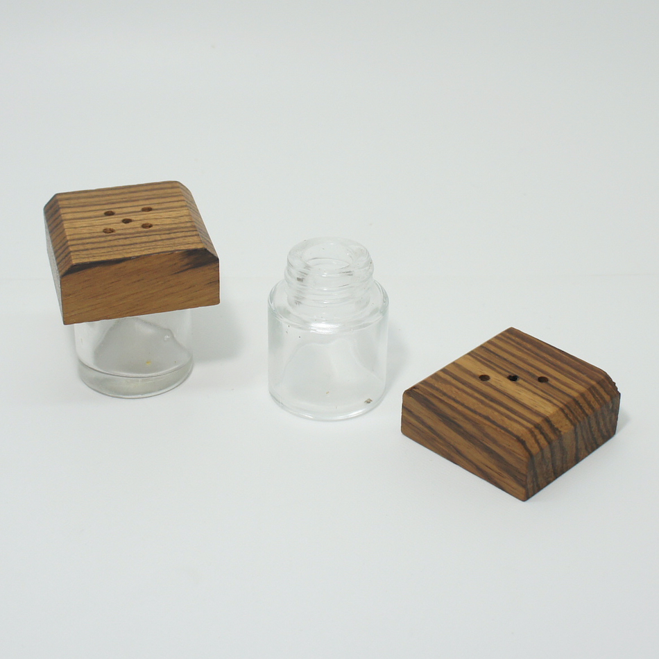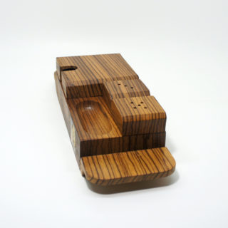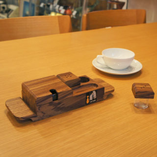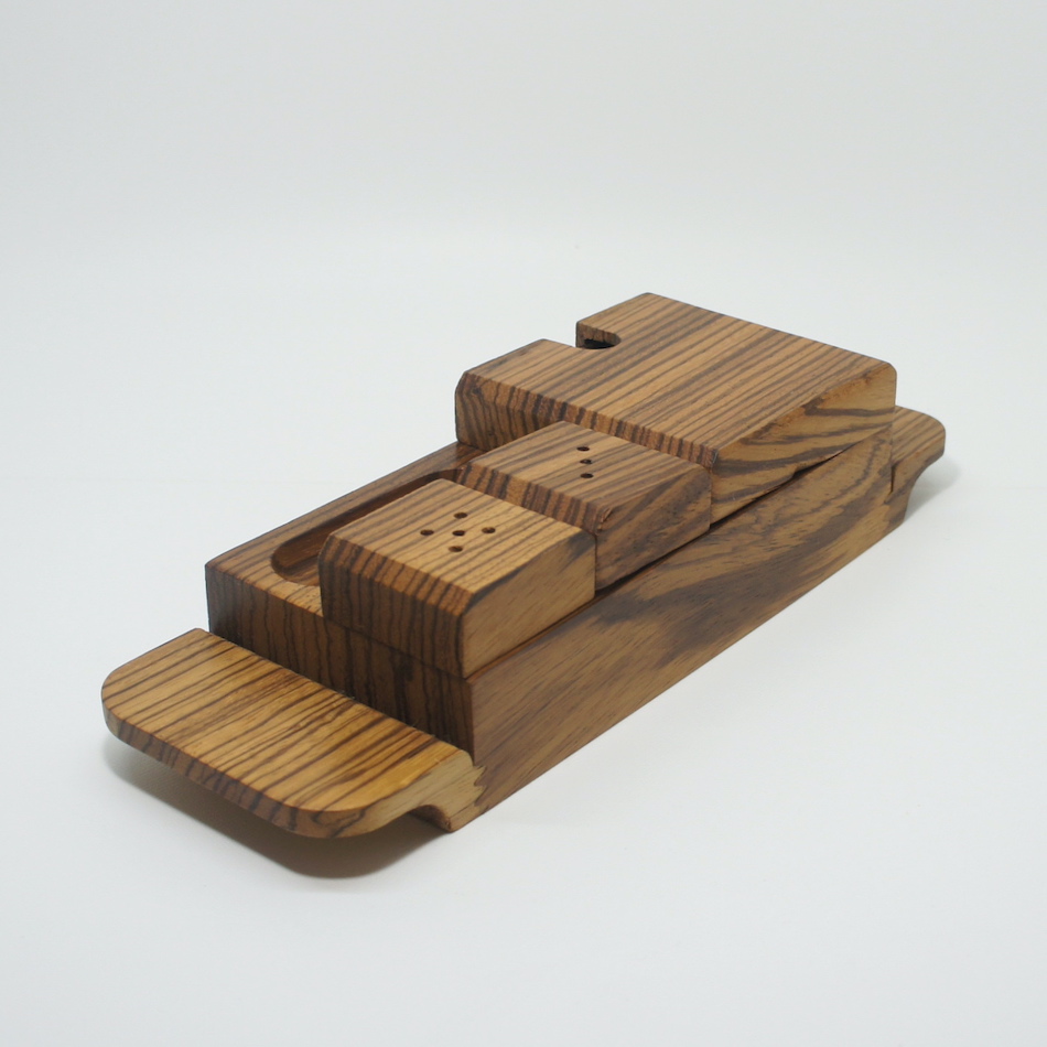 素材には杢のコントラストが鮮明なゼブラウッドを使用し、ソルト&ペッパーとポットをワントレーに収納したスクエアなデザイン。丁寧な面取りや各部の仕上げも美しく小品ながら非常に高品質なプロダクトです。