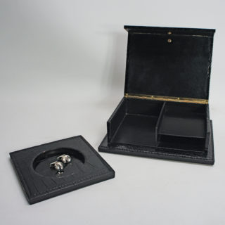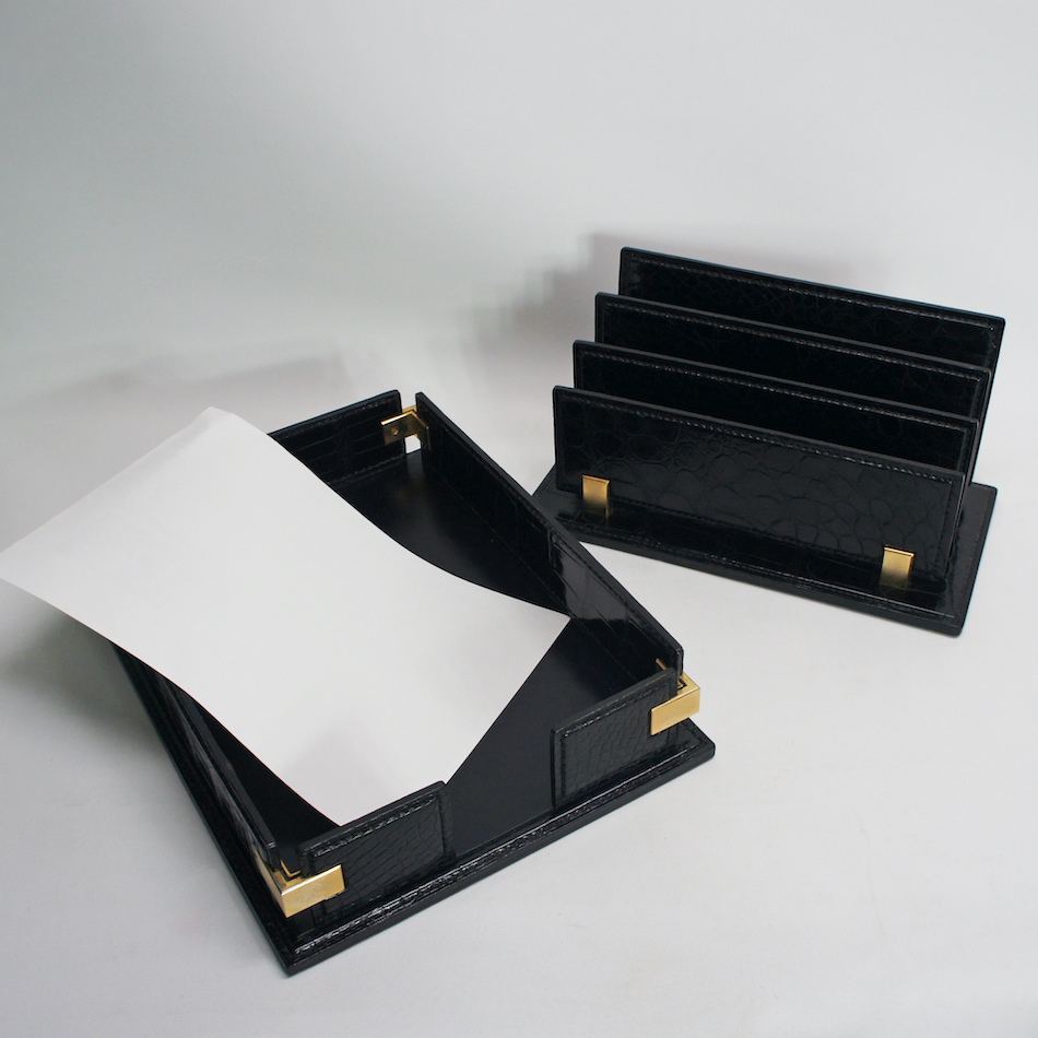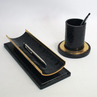 希少なクロコダイルレザーをエナメルブラックに染め上げ、その美しい斑の魅力を最大限に活かした最高級仕立てのデスクギア。