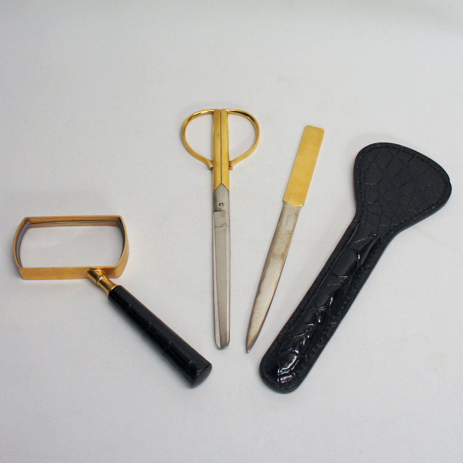 ハサミとペーパナイフはドイツ・ゾーリンゲンの ” PFEILRING/フェイリング “、ルーペは”Zeiss”。随所に精巧な真鍮金具を配し職人が丁寧に加工・縫製を施した完璧なラグジュアリー品質の追求。