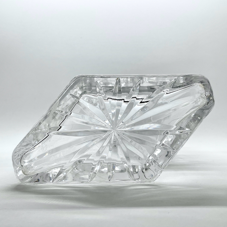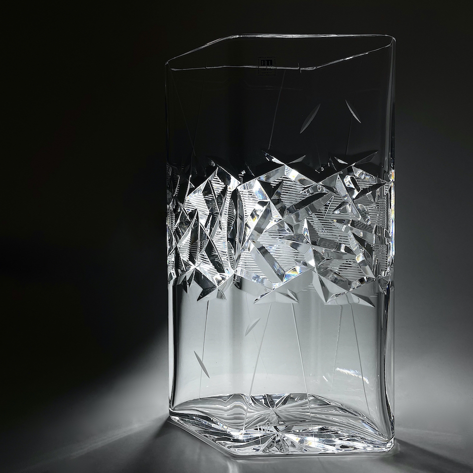 シャープなカットラインがランダムに交錯する幾何学レリーフがクリアボディーを透した光を乱反射させ抽象彫刻のような陰影を描き出すエレガントなデザイン。