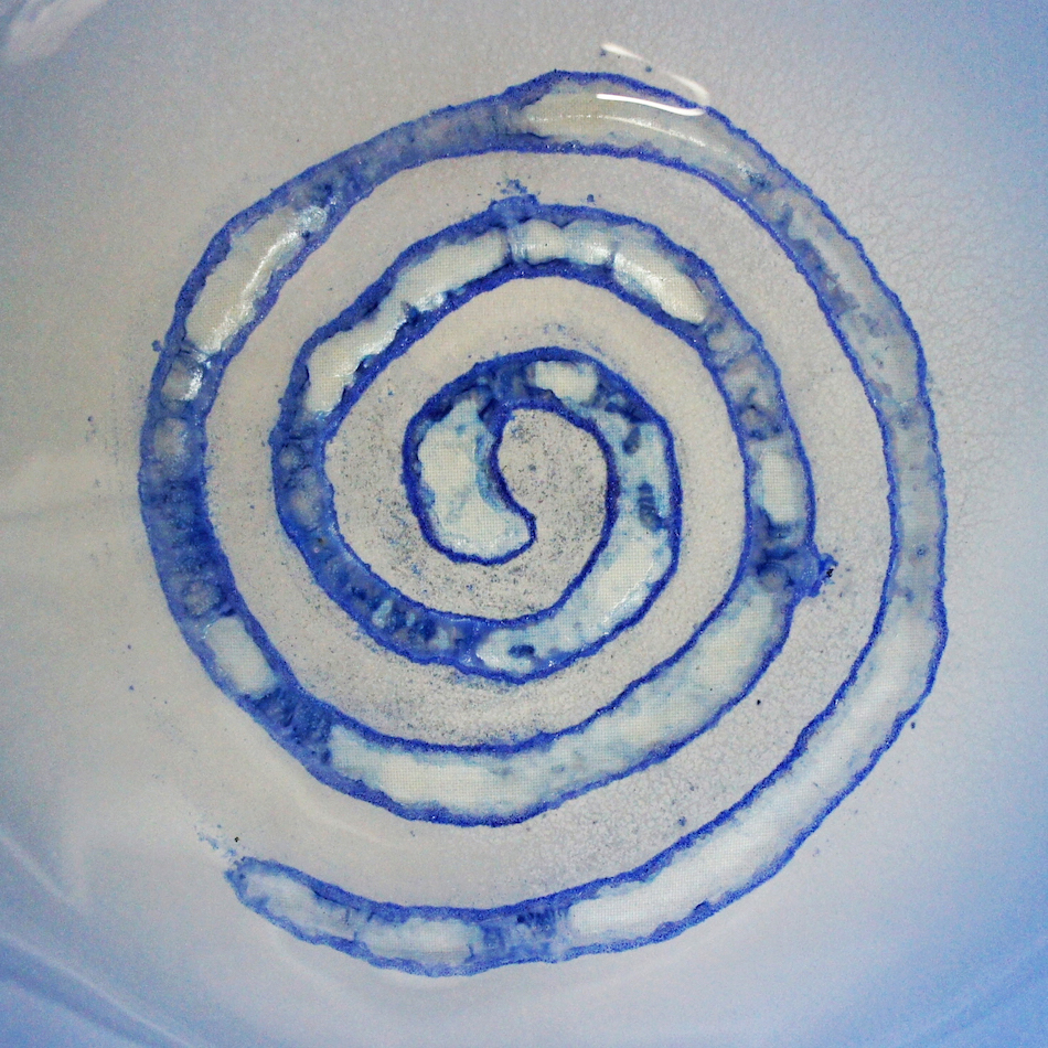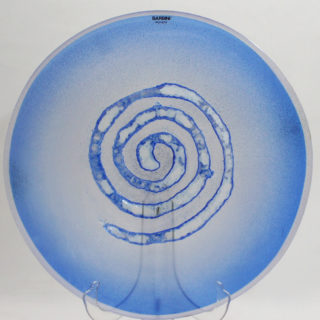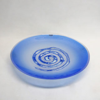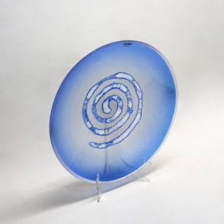 当作は、爽やかなライトブルーのラージプレートの中央に大きな渦巻き模様を”Scavo”のテクニックで大胆に描いた作品。渦巻きの輪郭は不規則にグラデーションブルーの金属質の文様が散らばる “Scavo”の特徴を活かしながらも、全体の荒々しさを抑え、洗練したイメージに仕上げたモダンデザイン。