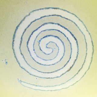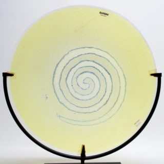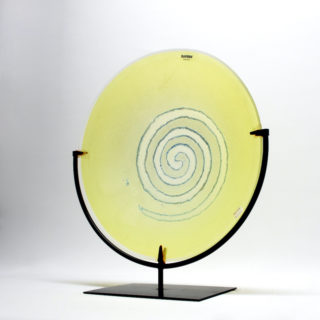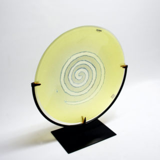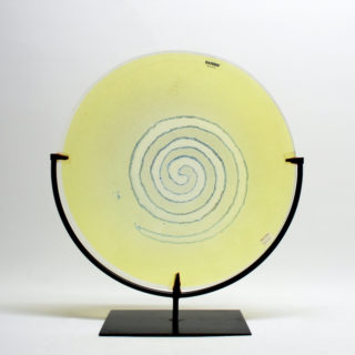 当作は、爽やかなライトイエローのラージプレートの中央に大きな渦巻き模様を”Scavo”のテクニックで大胆に描いた作品。渦巻きの輪郭は不規則にブルーの金属質の文様が散らばる “Scavo”の特徴を活かしながらも、全体の荒々しさを抑えて洗練したイメージに仕上げたモダンデザイン。