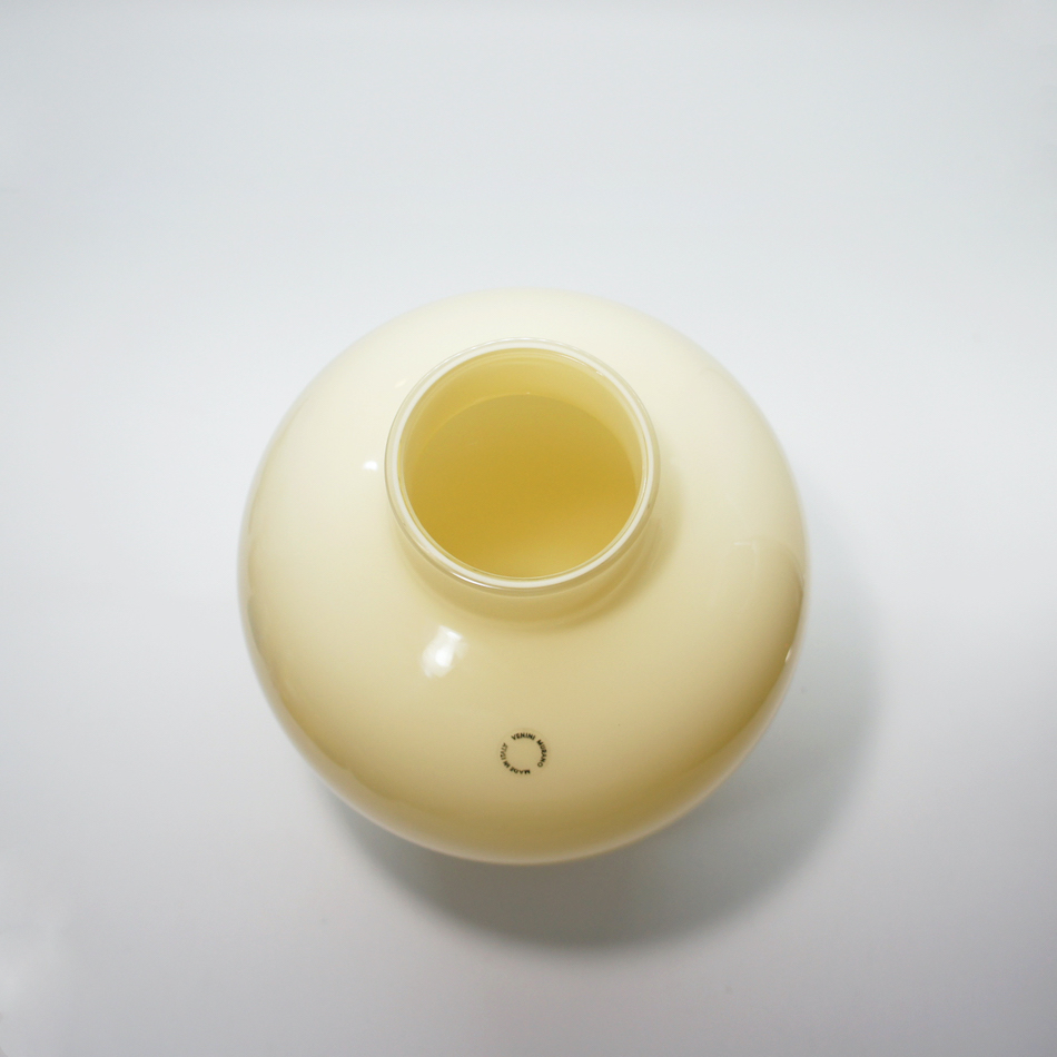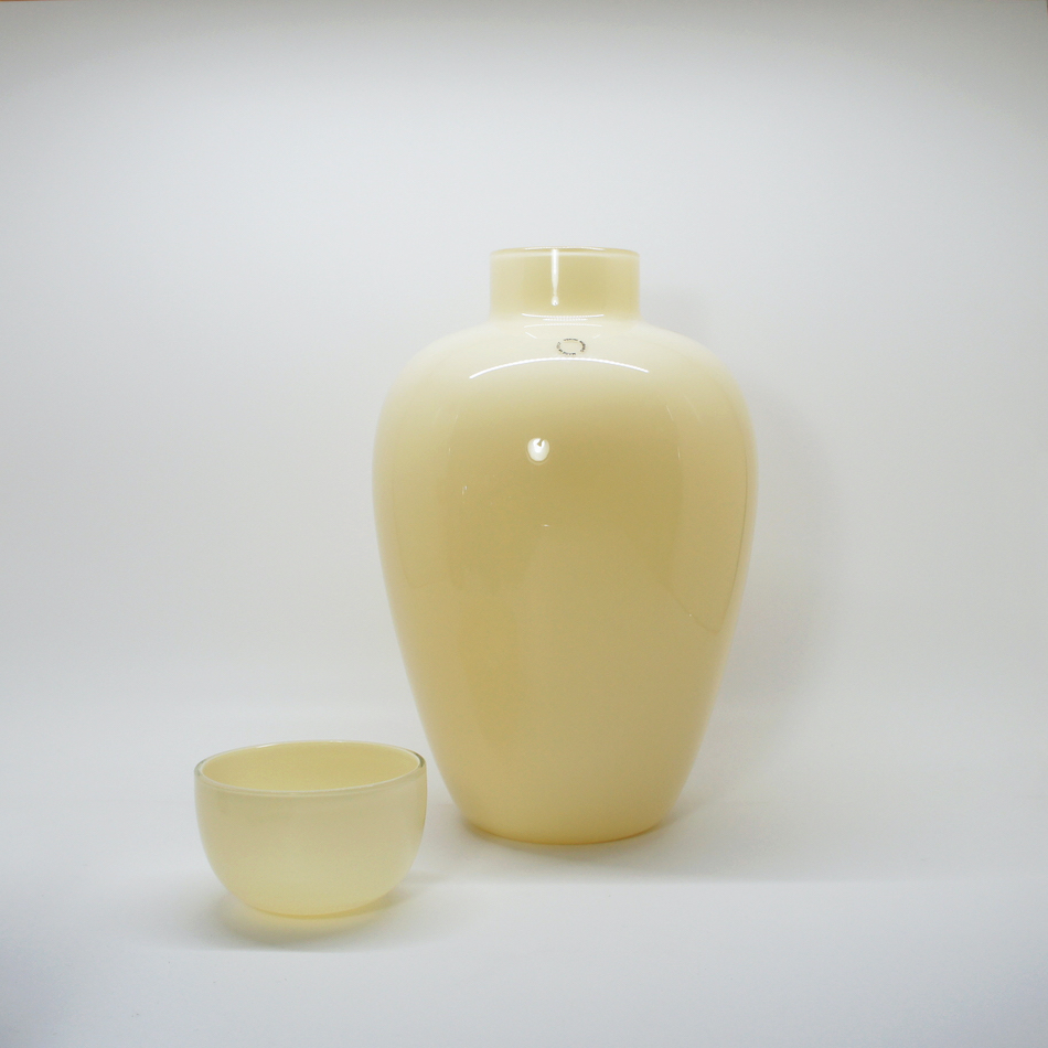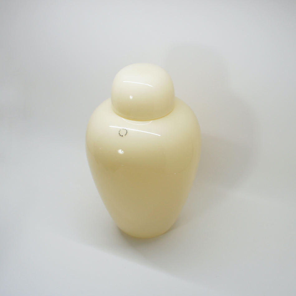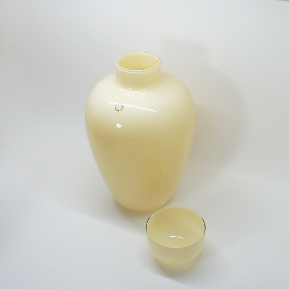 “Cinesi=中国風”と名付けられたこのベースは、伝統的な中国の「茶入れ壷」をイメージし、ふっくらとした胴と半球型の蓋を備えるユニークなグラスデザイン。