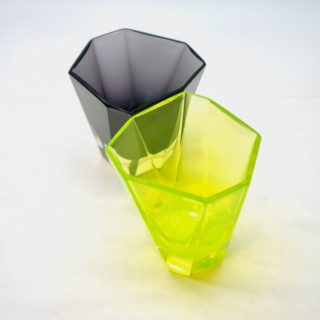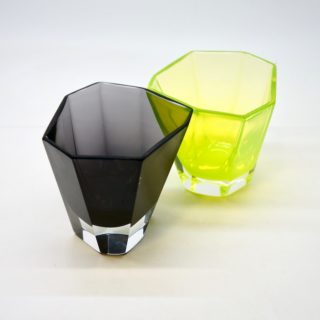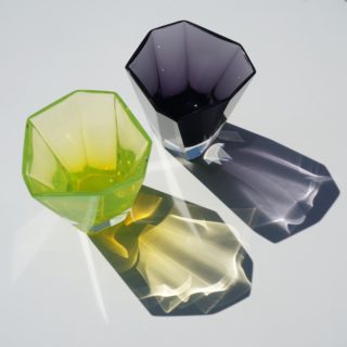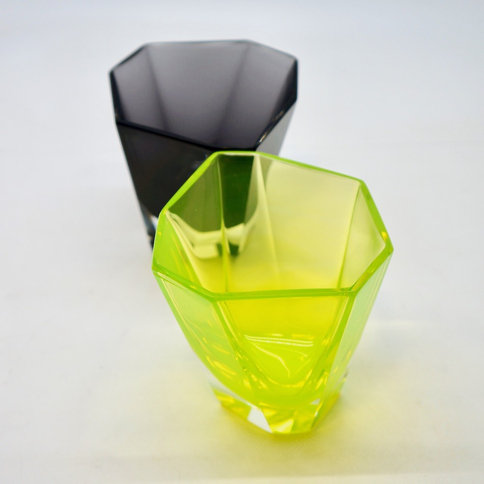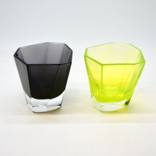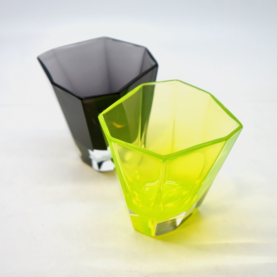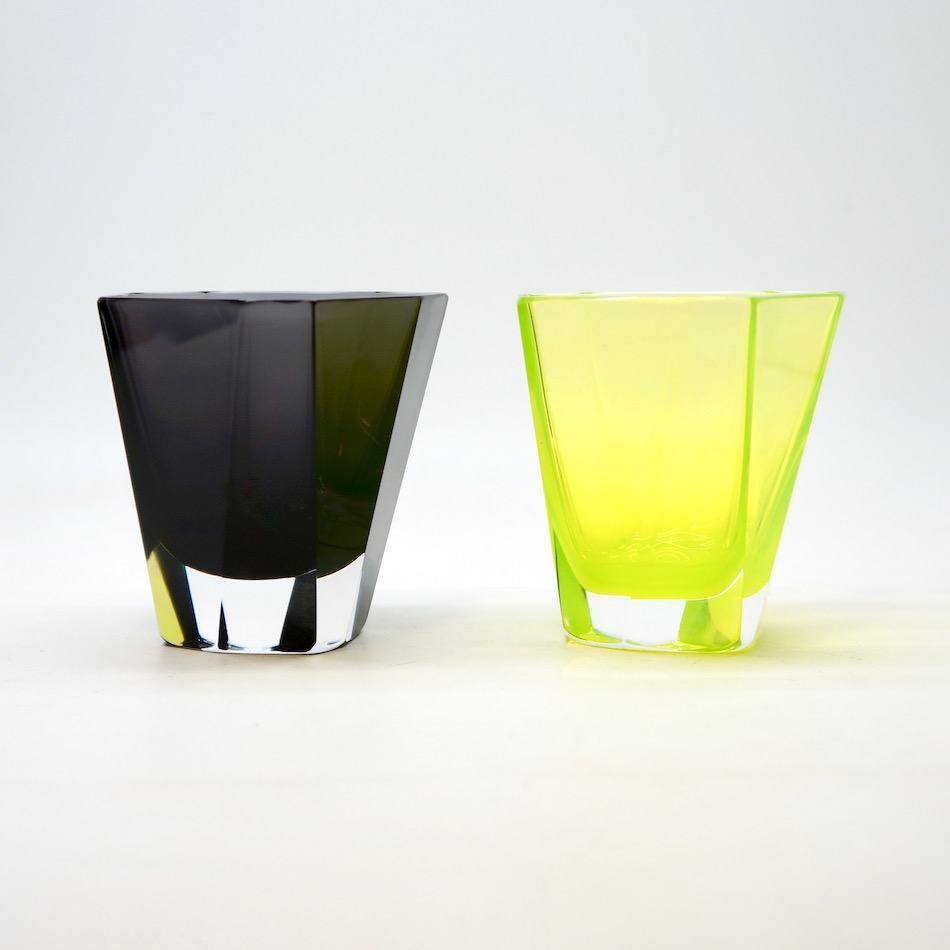 蛍光カラーのようなイエローグリーン、ブラックとパープルの中間のようなミステリアスな黒、という2色の洗練されたガラスの色彩。同工房が得意とするガラスの色表現は、他のムラノの工房製品とは一線を画する独自の魅力を発するアイテム。