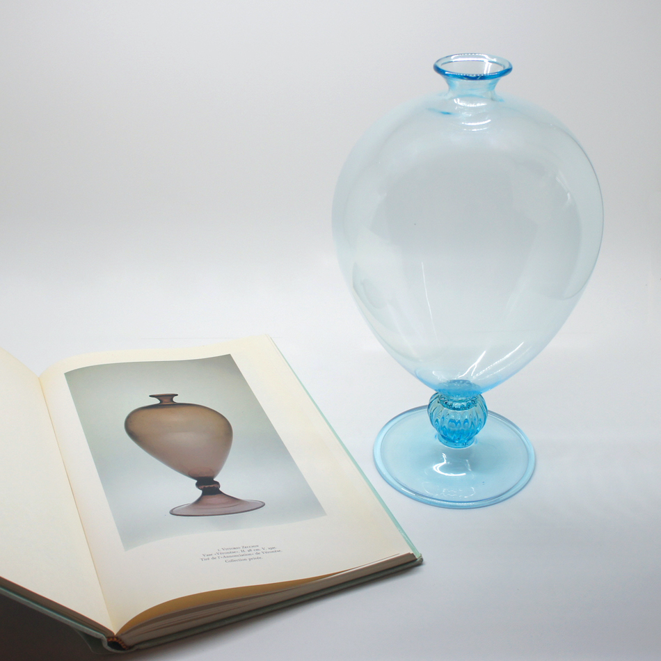 1921年、”Vittorio Zecchin / ヴィットーリオ・ゼッキン”が、Paolo Veroneseの絵画からインスピレーションを受け発案したこのベースは、風船のように大きく薄く拡がった胴体部に、小さく開いた口と、わずかに装飾された脚元….と、当時のムラノガラス界にとっては画期的にモダンなデザインで、”VENINI”さらには”ムラノガラス”のその後の方向性に重要な影響を与えたあまりにも有名な作品です。