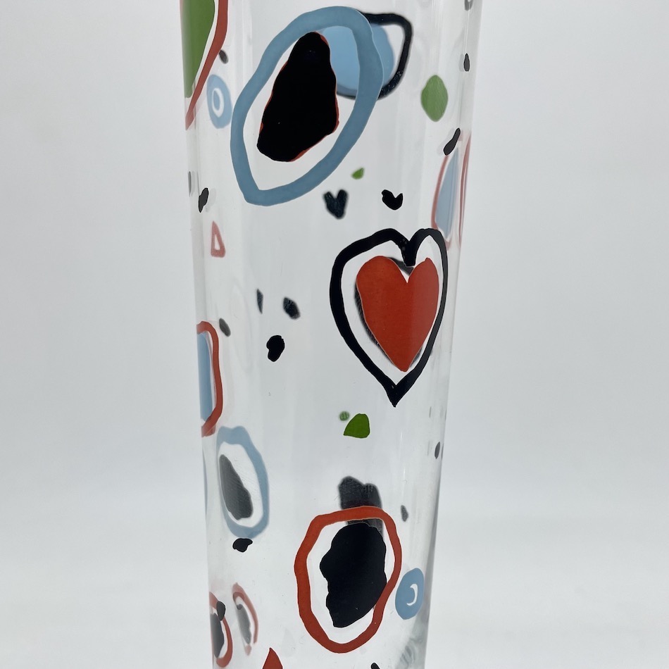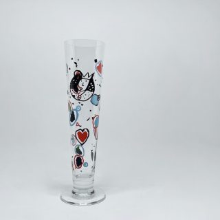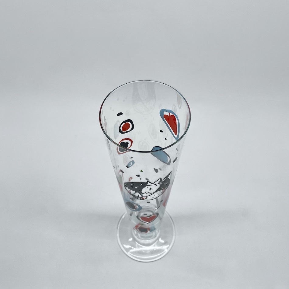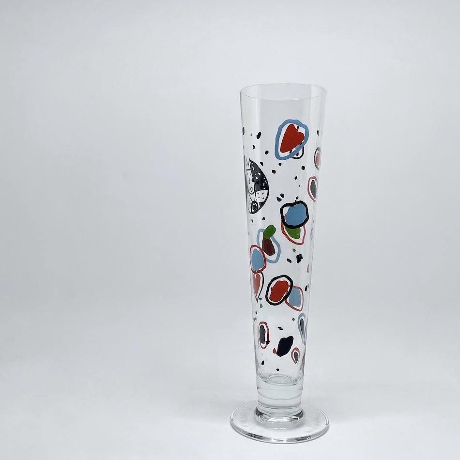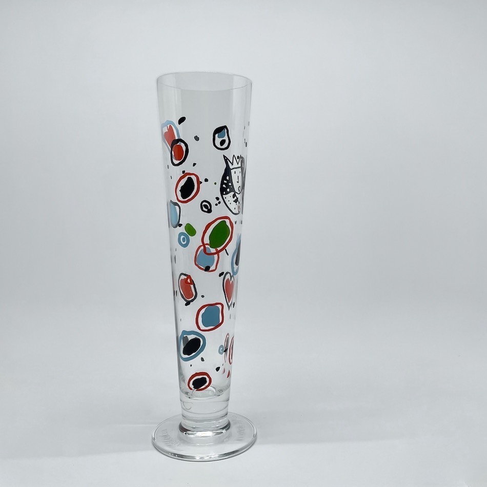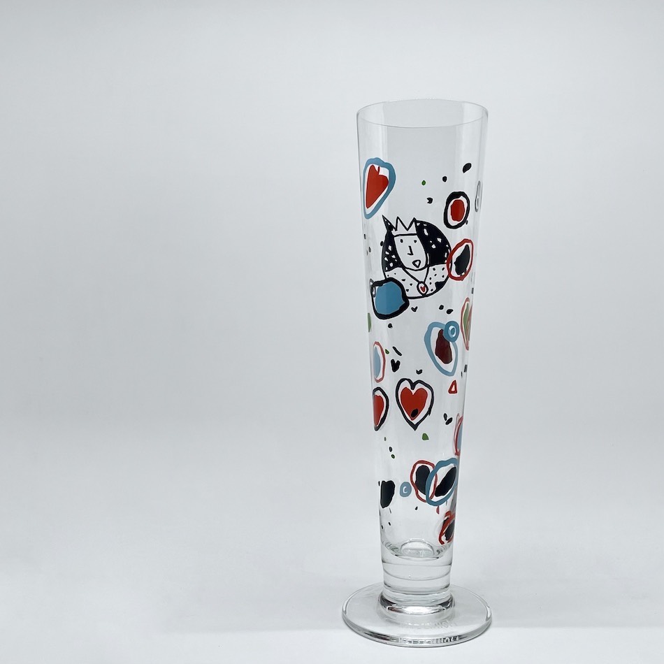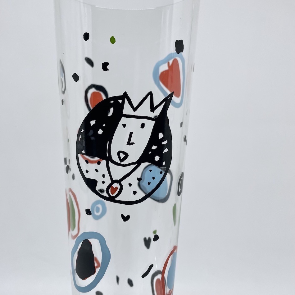 王冠被る人物と、散りばめられたハートやドット。氏のPOPな感性がグラス全体に表現されたビアグラスです。