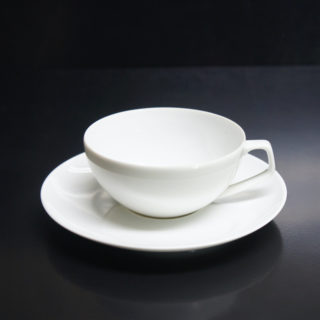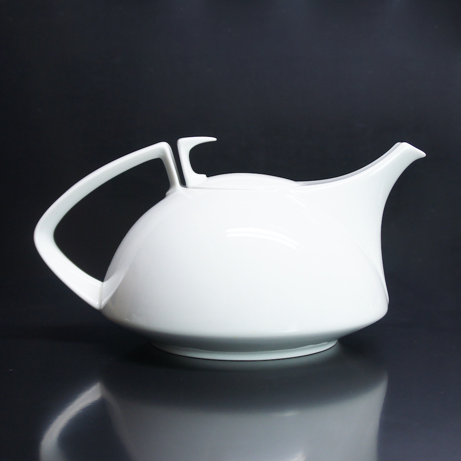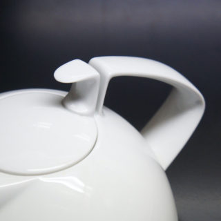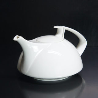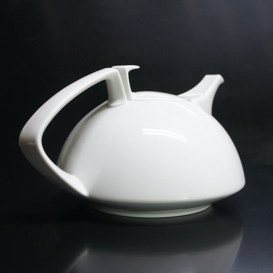 優雅な曲線のフォルムは、ティーポットとティーカップが上下対象の形状を成すシンメトリックなフォルムで統制を取ったトータルデザイン。ポットのハンドルと繋がる流線形のツマミがキーとなり、比類なき美しさと完成度を授けられたテーブルウェアシリーズです。