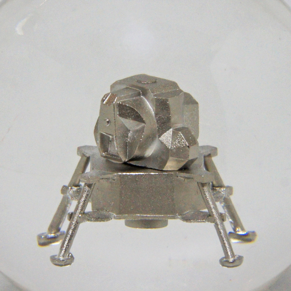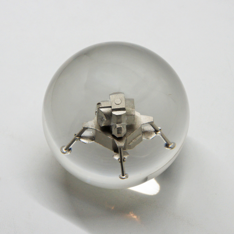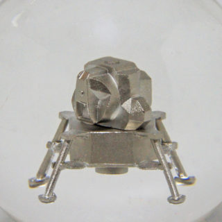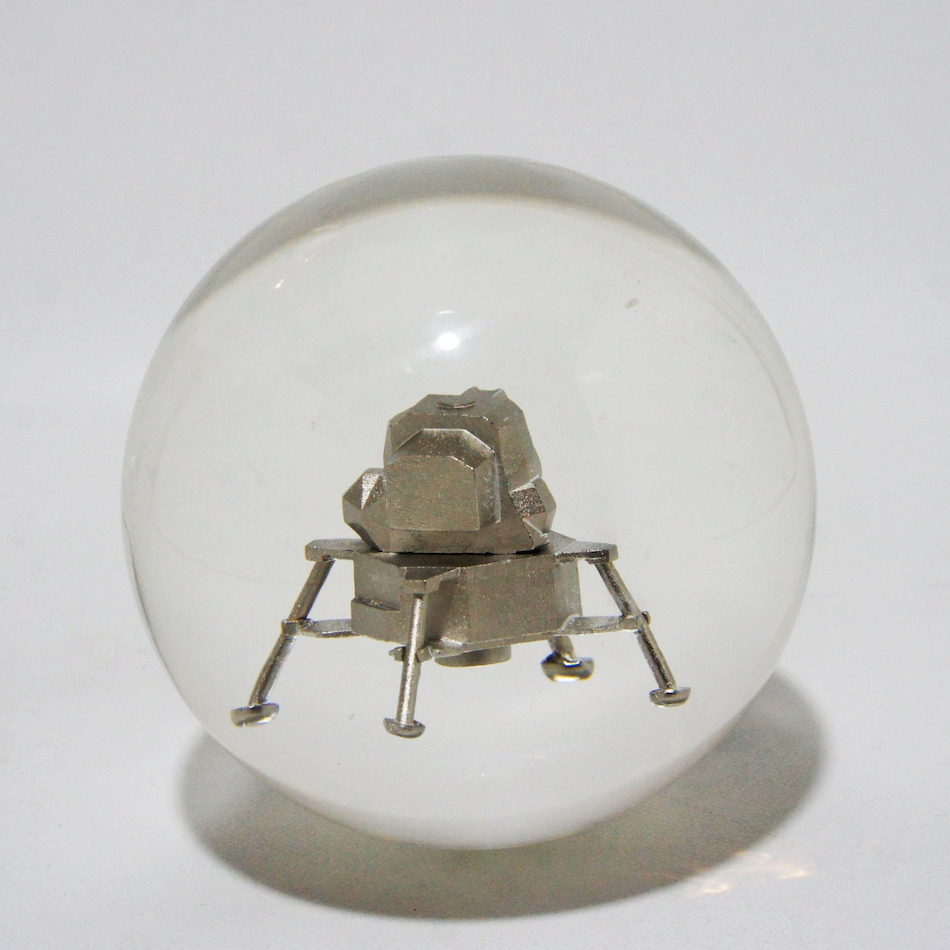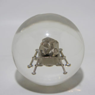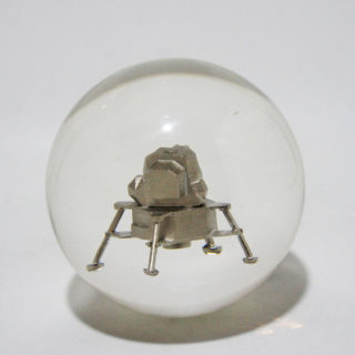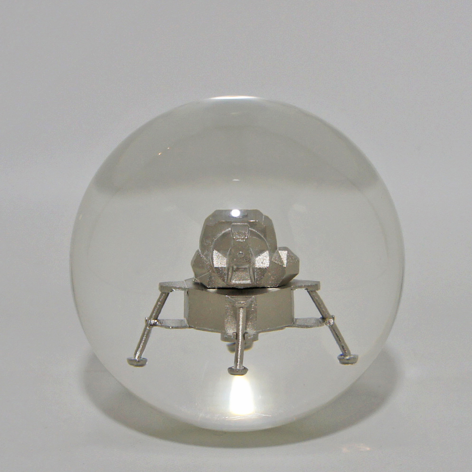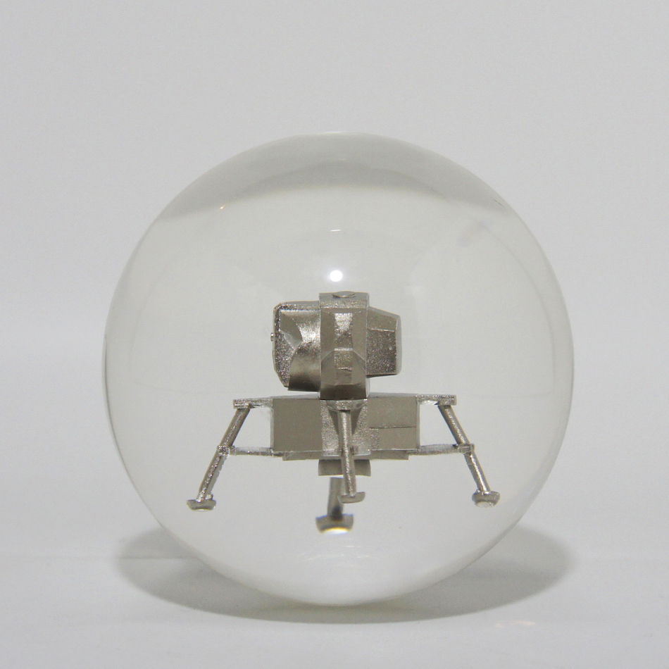 アイテムは、その月面着陸船 “Lunar Module / ルナモジュール = 愛称イーグル”の立体模型を直径100mmのアクリル球体に閉じ込めたルーサイトオブジェ。