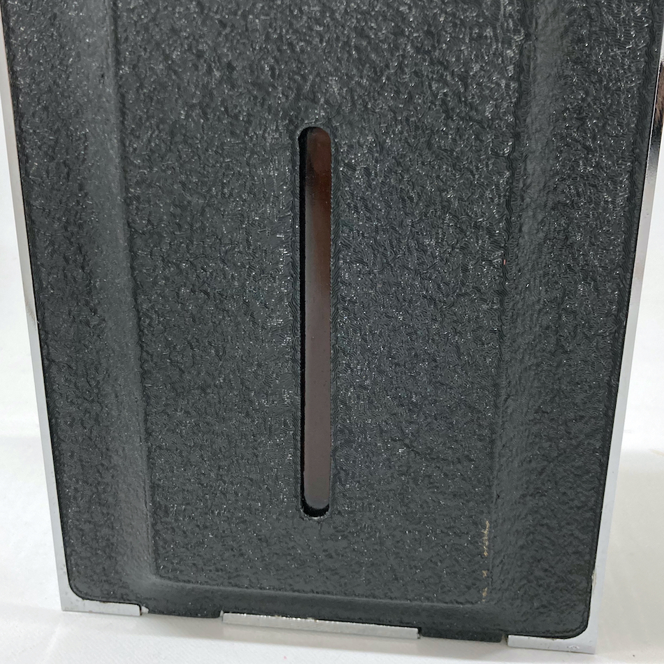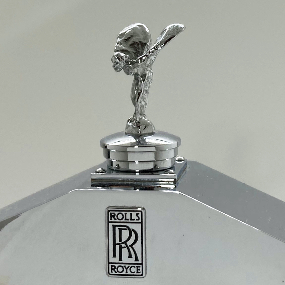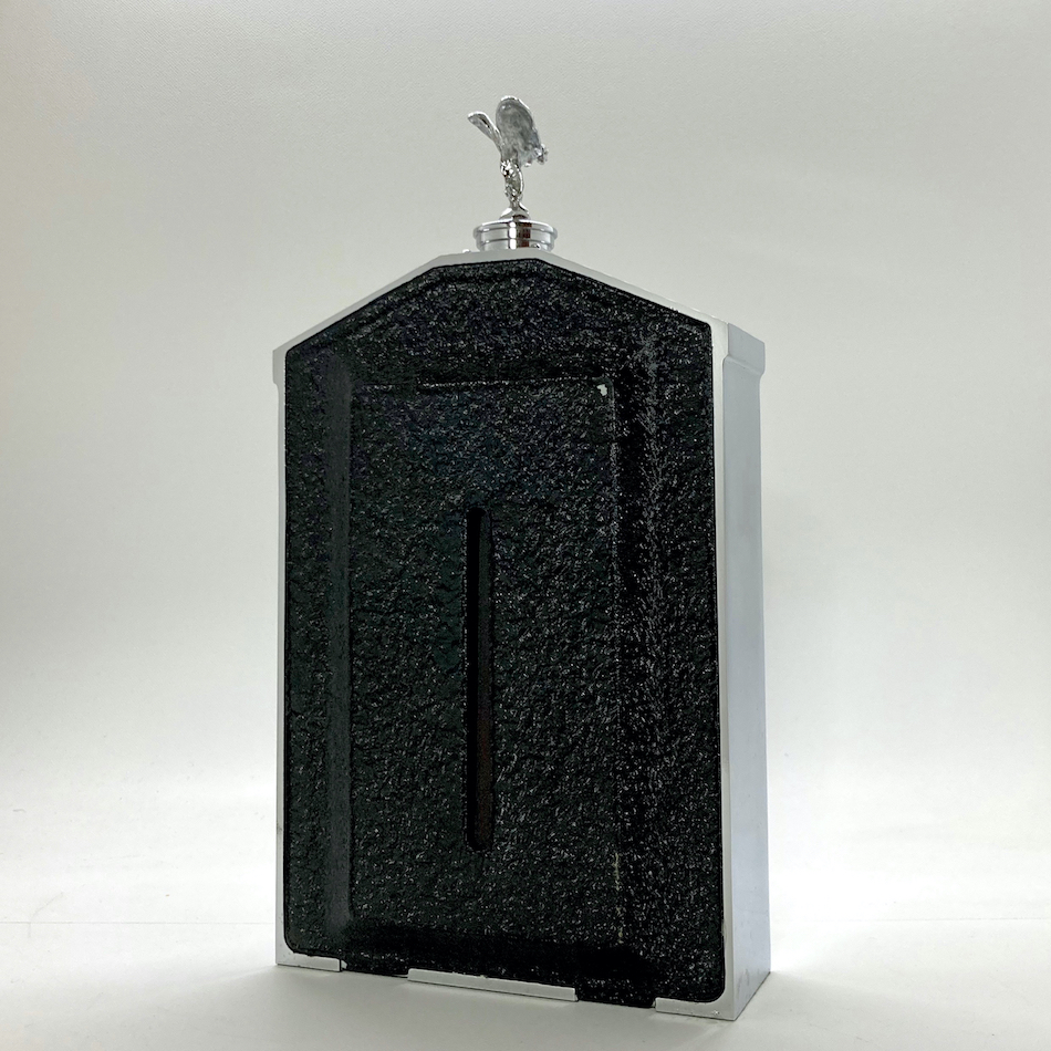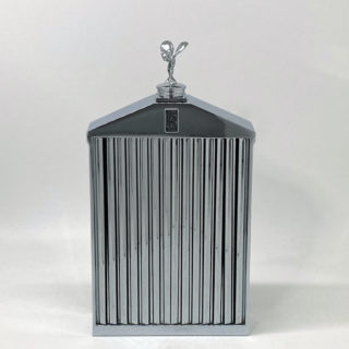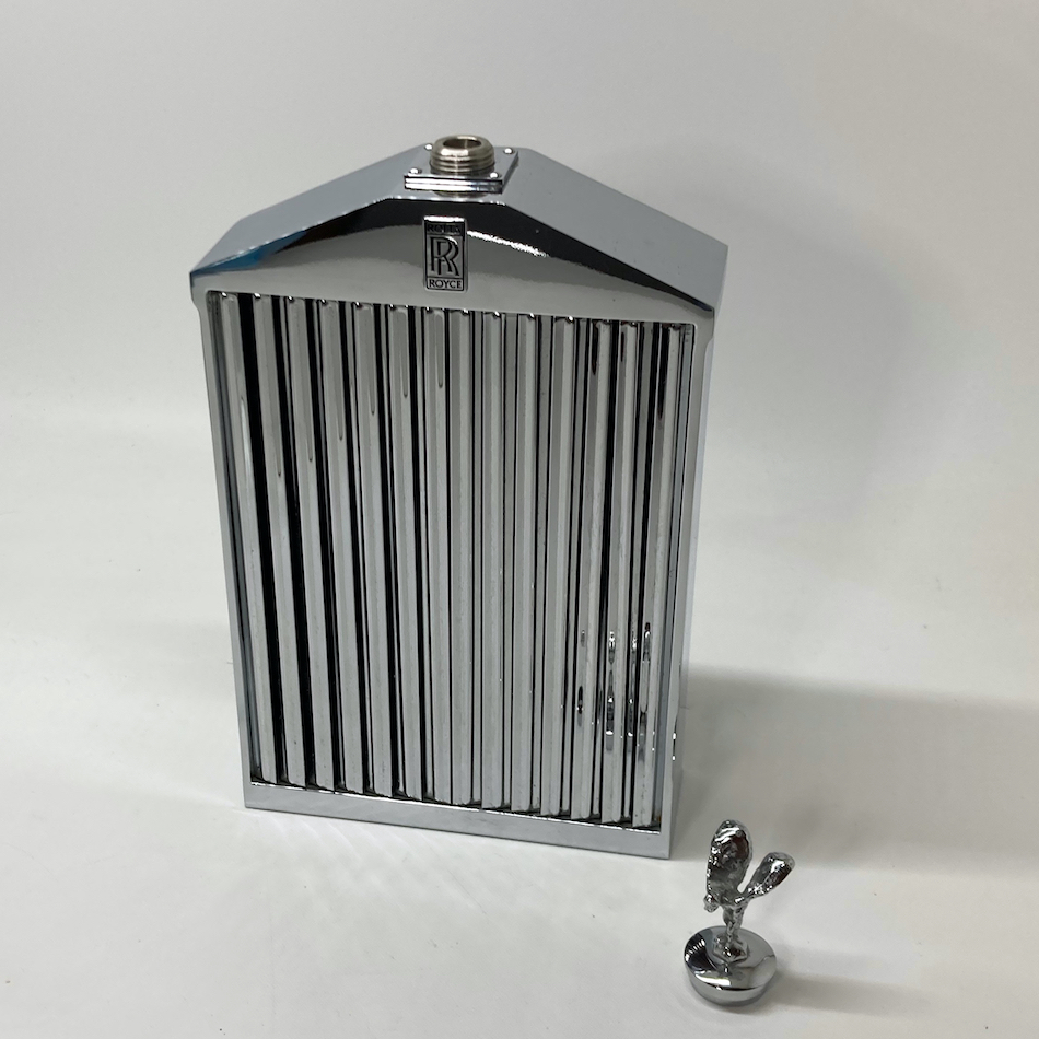 ガラスボトルをカバーする金属と樹脂でできたクロムメッキケースは、当時の”ロールス・ロイス”のフラッグシップモデル”シルバー・クラウド”のフロントグリルを忠実に再現したフォルム、そのトップを飾る”フライングレディ(スピリットオブエクスタシー)がボトルリッドとなった高級感漂う一品。