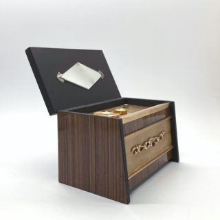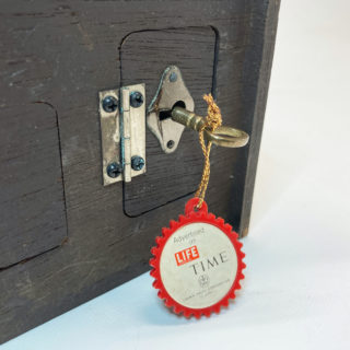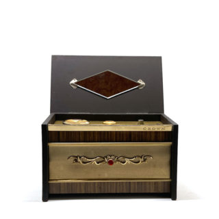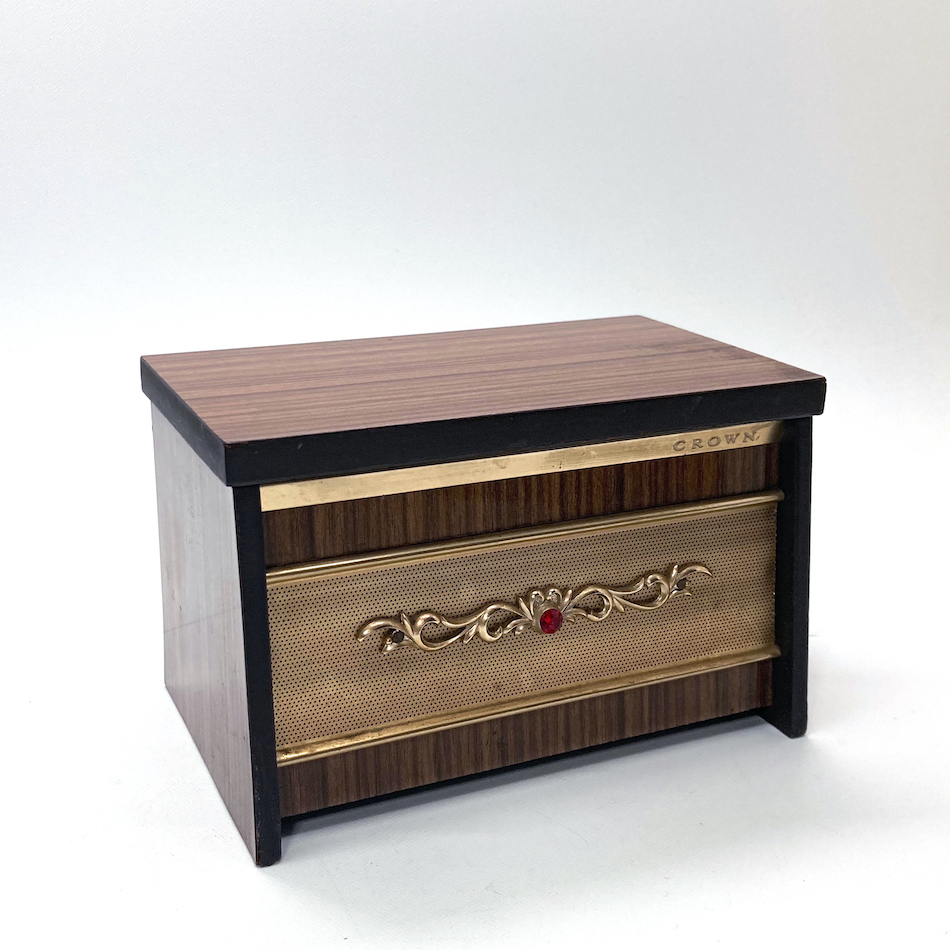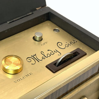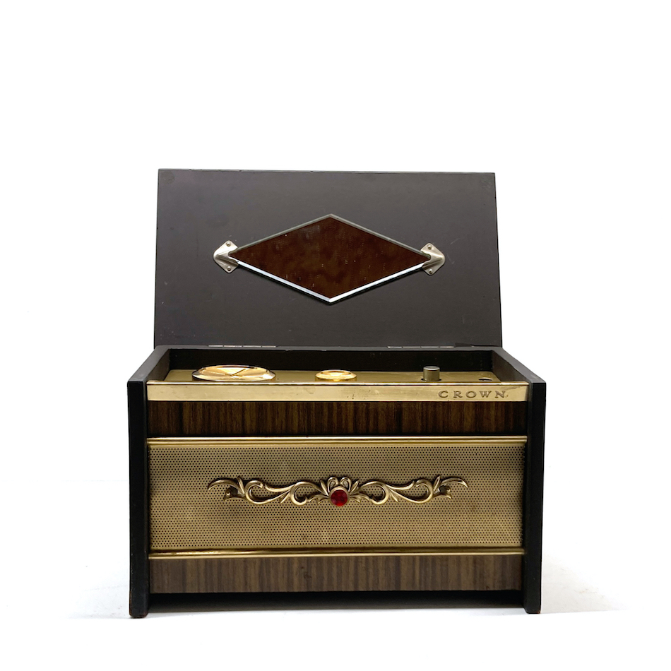 “CROWN / 旭無線電気”製のキャビネットステレオのようなボックス型ラジオは、蓋を開けてコインを投入口に差し込むことでスイッチが入りAMラジオ受信ができ、OFFのボタンを押すとコインは落下しラジオスイッチが切れて貯金されるというユニークな仕掛けです。