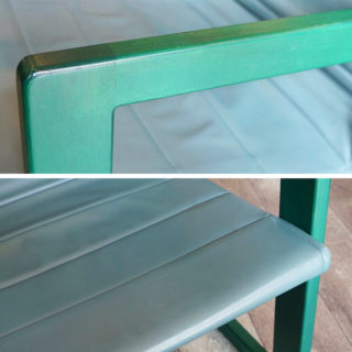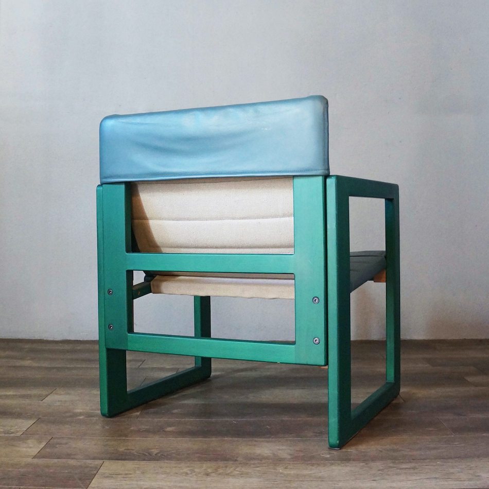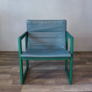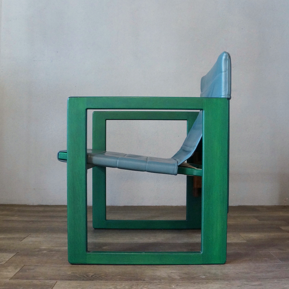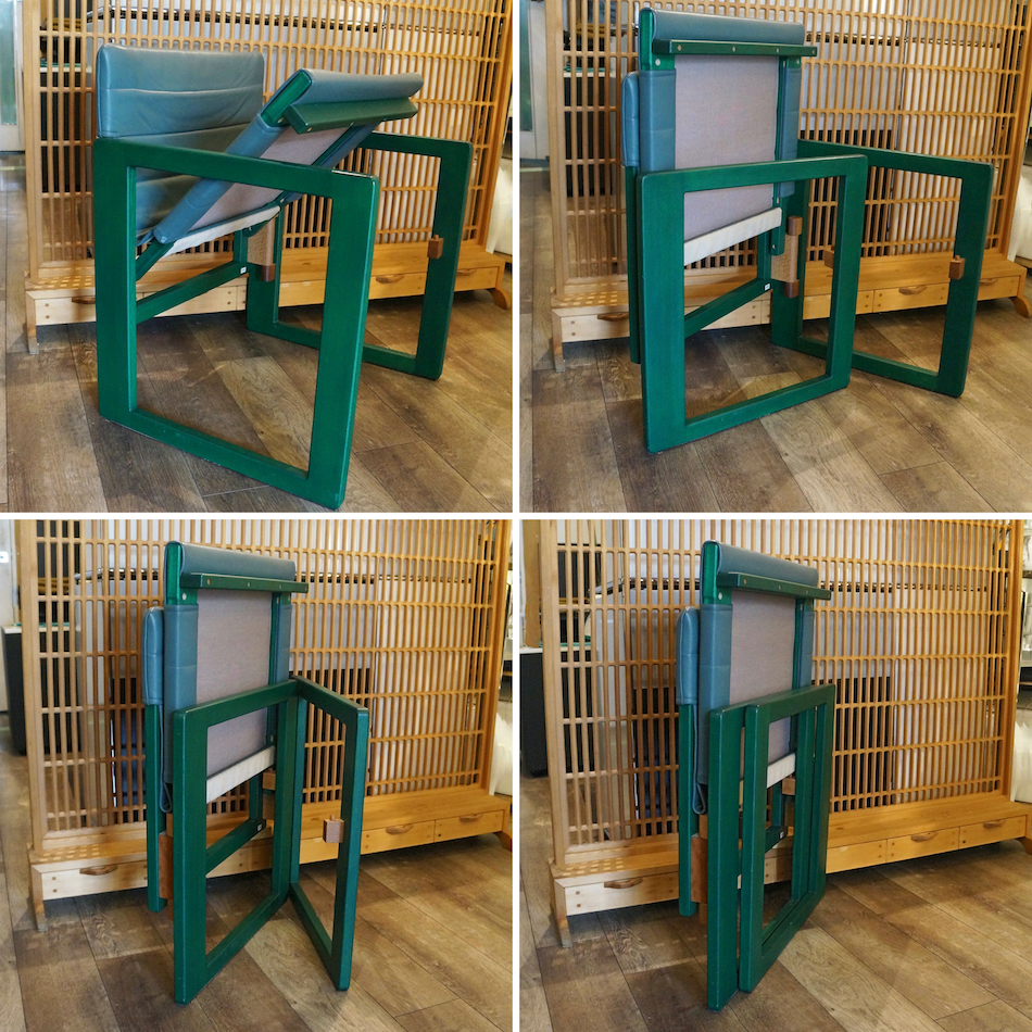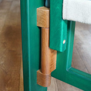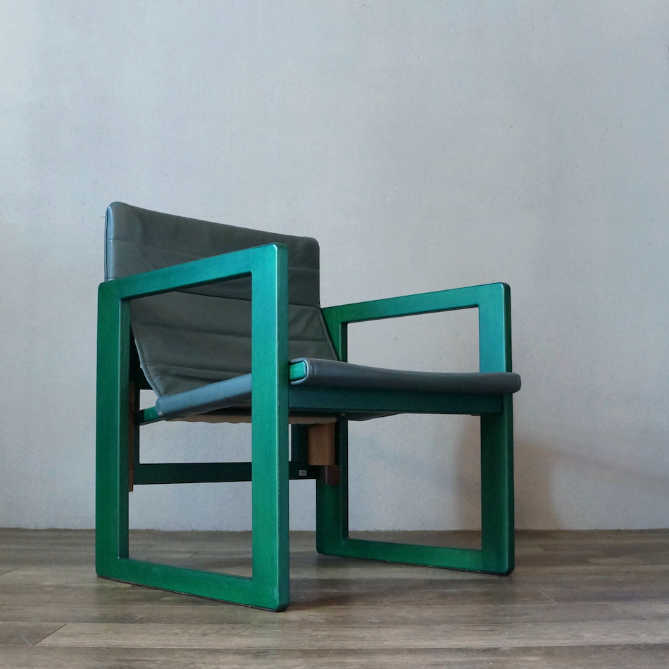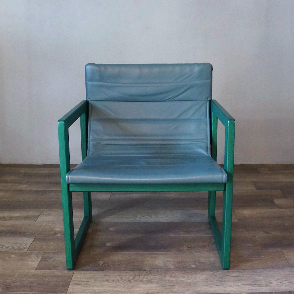 現在、フレーム素材はオリジナルの米松であったものが吉野杉かアルダー材に変更され、黒、赤、緑の3色設定されていた木部着色も廃止となってしまっていますが、入荷品はオリジナルのグリーン着色された米松フレームにグリーンの本革シート、この「緑」は”吉村順三”が特にお気に入りであった色。