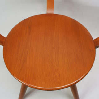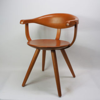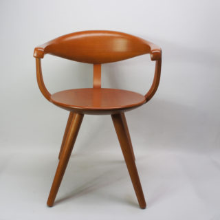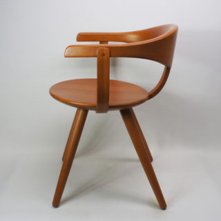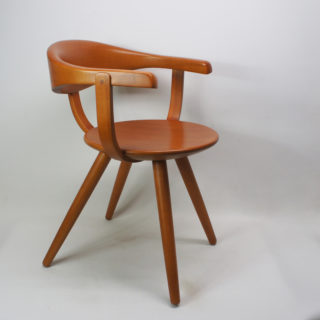 当店では、その存在や販売背景が検証できなかった為、お世話になっているデザイナー/コレクターの”永井敬二”氏が来られた際に直接お尋ねしたところ、「当時の柳ショップでは独自に”アームチェア”を販売していた事。柳宗理さん側から天童木工に製造を委託したためラベルや刻印はない事。材はマコレを使用していた事」などの情報を頂き、この椅子の特徴、来歴と一致することが確認できました。