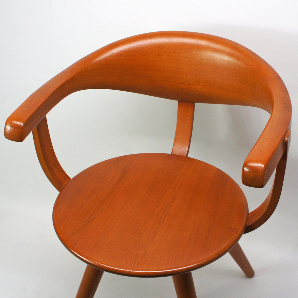 分厚く、丸みを帯びた独特のアームは「一本曲げ木」という高度な技法で成型。柳氏は自ら座りながら手直しを重ね10年の歳月をかけて完成させ、自宅、オフィスの両方で愛用し続けたこだわりのチェア。