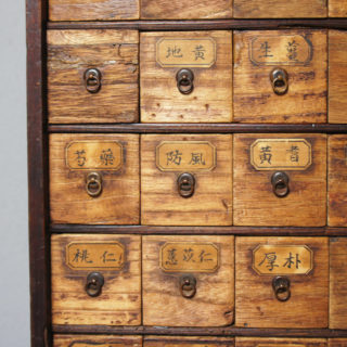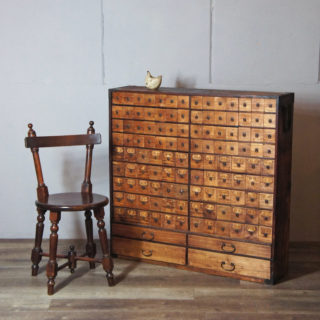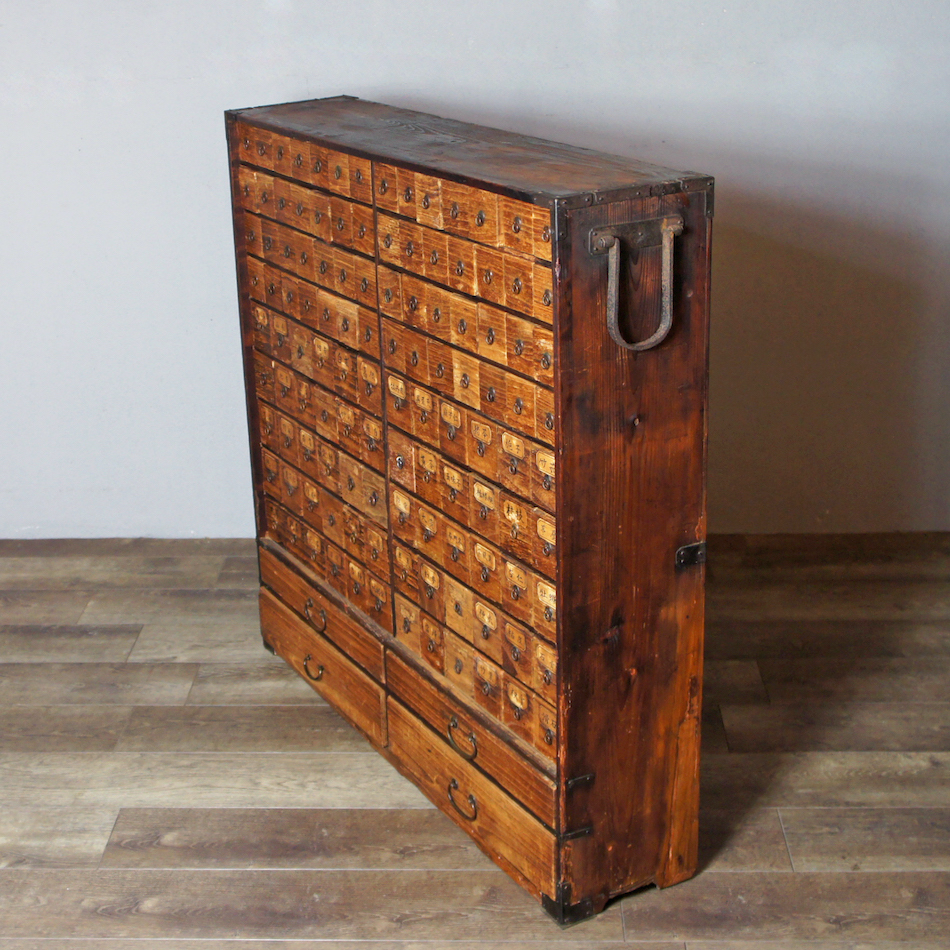 これほどの数の抽斗が備わった薬箪笥は非常に希少で実用レベルの商品となると相場も高額ですが、”モダンデザイン”を専門とする当店としては異端のアイテムという事情から破格のプライス設定としています。