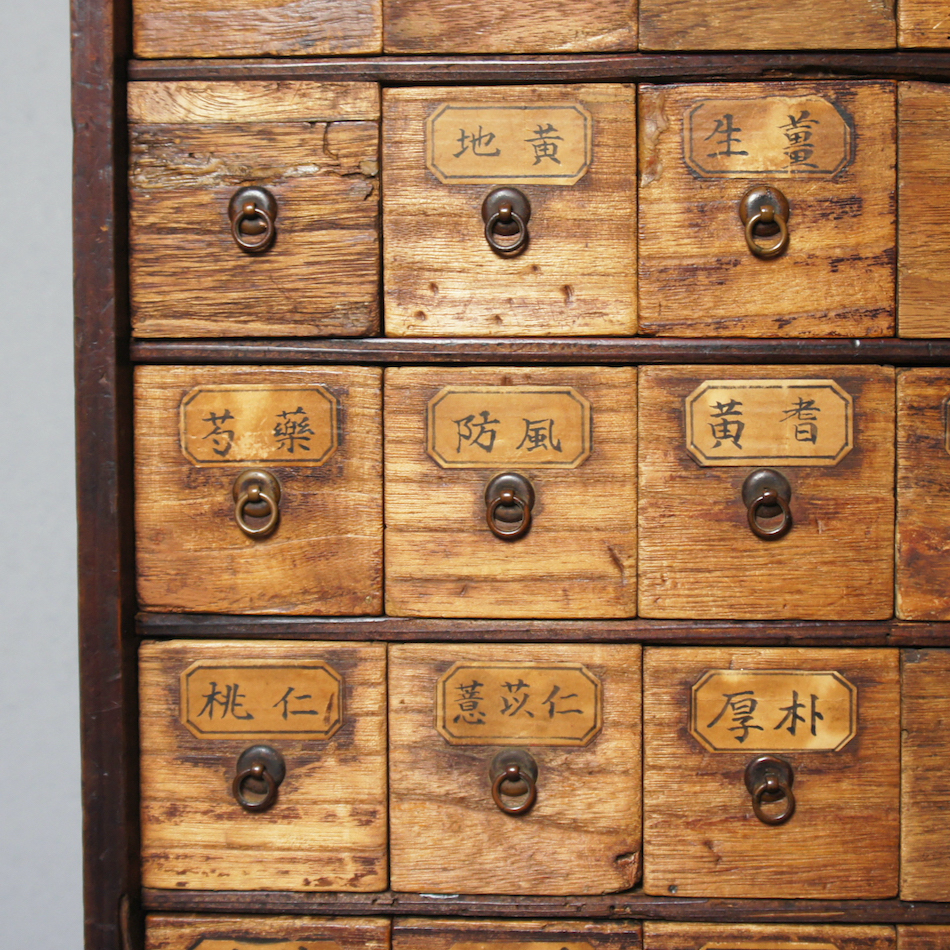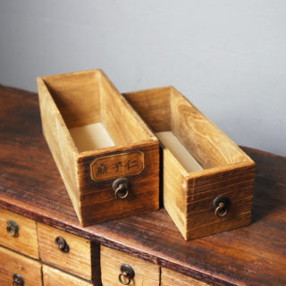 実際に漢方薬の商家で使用されていた痕跡として、抽斗には薬の名を書いた札が部分的に残り、側面には「竿通し」の金具が設けられ、行商には金具に竿を通して外に持ち出しできるように設えてあります。<br>