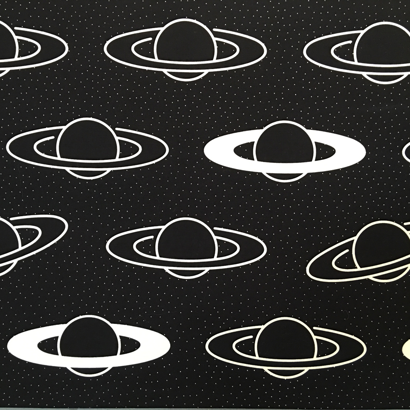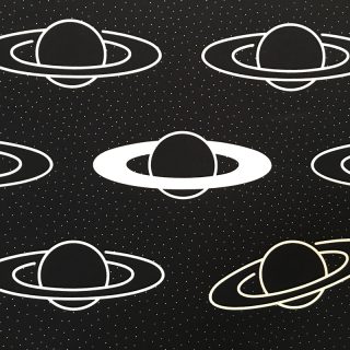 土星をモチーフに点と円、モノクロームの大胆かつシンプルな構成はテキスタイル=布といった領域を超えたアーティスティックなデザイン。それぞれ違った配色と構成の4列1リピート分を縦横フルに使用し、粟辻ワールドをインテリアアートとして存分に楽しめます。