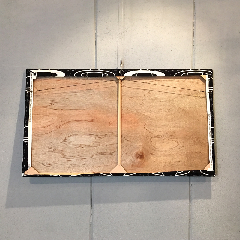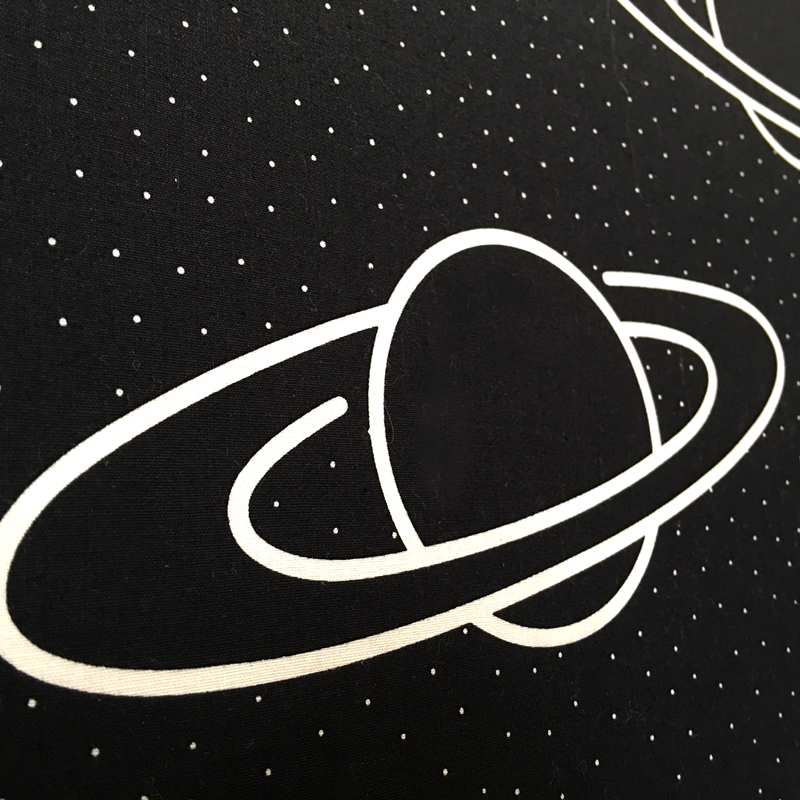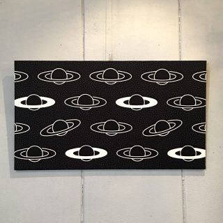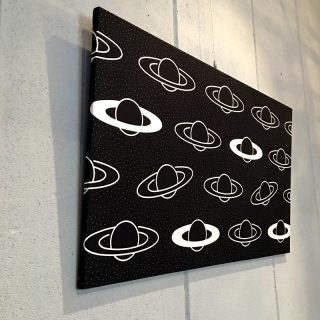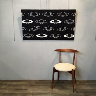 世界的テキスタイルデザイナー粟辻博が1982年にフジエテキスタイルより発表したHeartart/ハートアートシリーズの土星柄ヴィンテージファブリックで制作したウォールパネル。<BR>