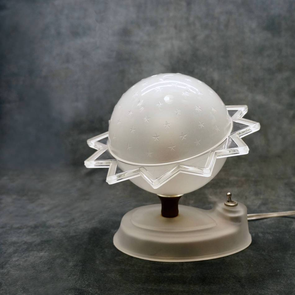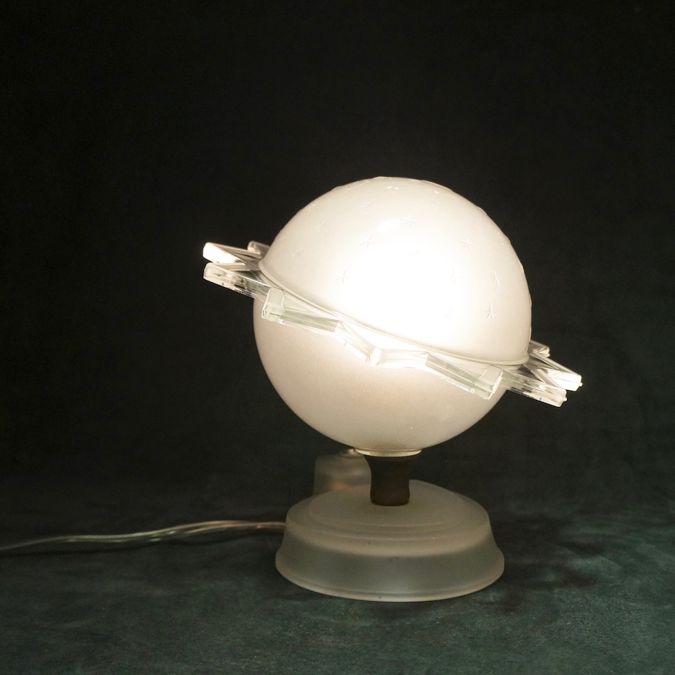 1920~30年代頃、アールデコ期の”天球/ 土星”をモチーフにしたガラス製テーブルランプ。
