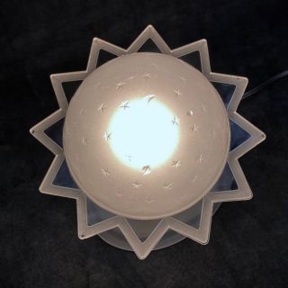 外周に大胆なジグザグを配したフロストガラス球体とそれを支える流麗なフォルムのフロストガラスの土台。球体表面には星や月の陰刻を散りばめ、柔らかな明かりが天球や土星のイメージを演出させる美しい照明。