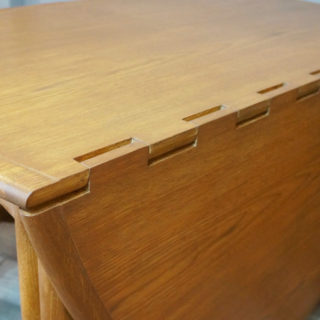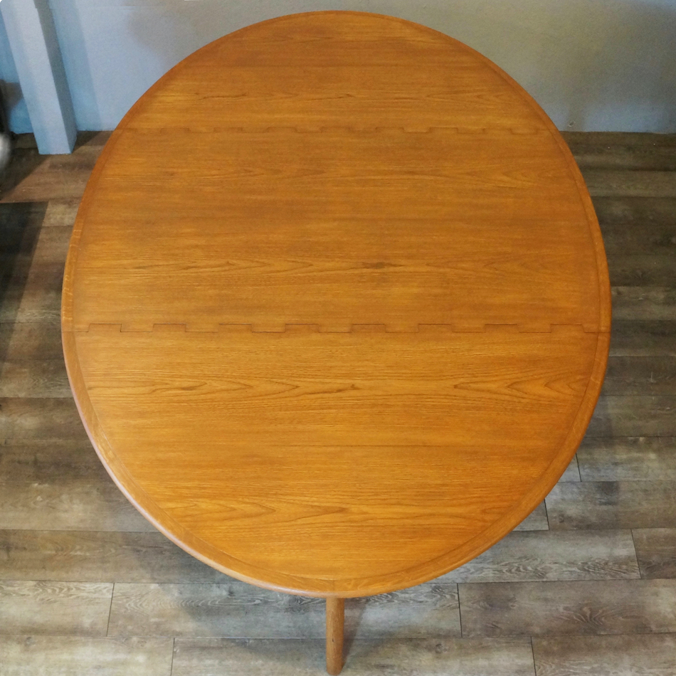 入荷品の主材はチークやローズウッド製が多く見られるなかでは珍しいオーク材、天板突き板に数カ所経年によるクラックと浮きが生じていましたが専門職人による修復とリフィニッシュを施し、違和感のない状態にメンテナンス済みです。