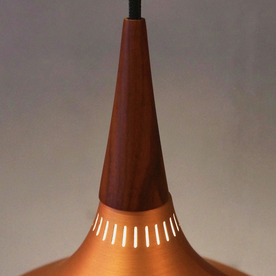 木型を使い手作業の絞り技術で作られるグラマラスな曲線の純銅製シェードに、ローズウッド製のトップハンドルを合わせた上質なデザイン。