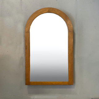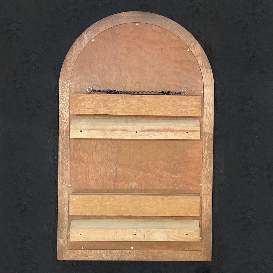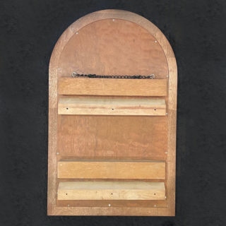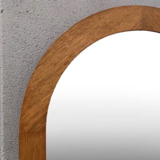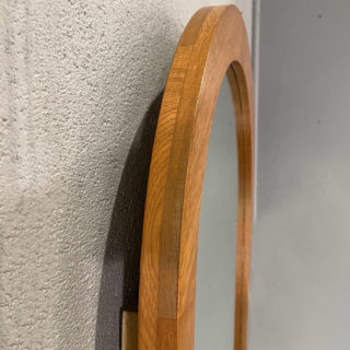 楢の集成板材を前後二枚貼り合わせた上部を半円のアーチとしたフレームは、その外形が横縦の比率1:1.6の黄金比で設計。また、アーチ部の左右終端とトップ中央の目地の接合部には材を一度斜めにカットして再び貼り合わせた三角形の意匠を潜ませる「意匠に隠れた倉俣流の仕掛け」を今回新ためて見出す事ができました。