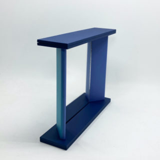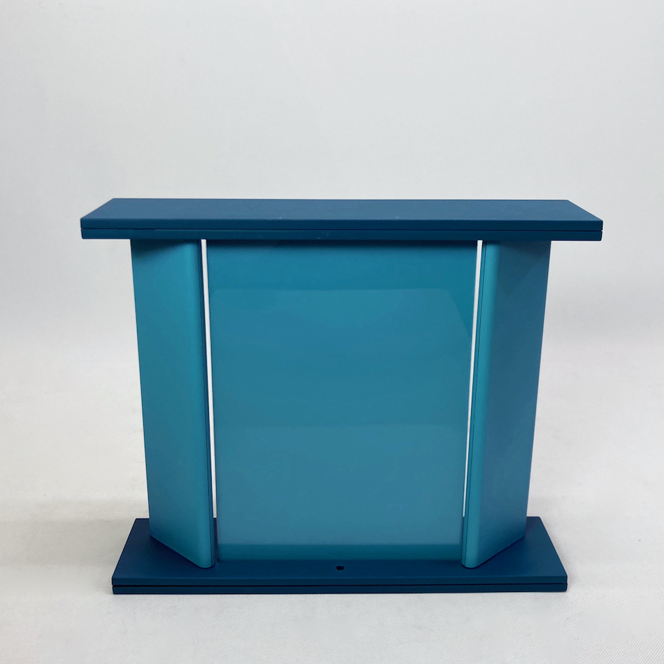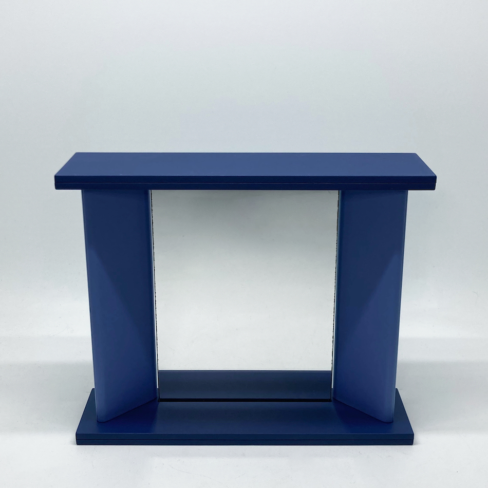 越前漆器製造のノウハウを活かし、フレームを日本の伝統色「瑠璃色、藤色、浅葱色」に近い3色のポリウレタン塗装で彩ったスタンドミラーは、すでに廃盤のため市場に残るものは希少。