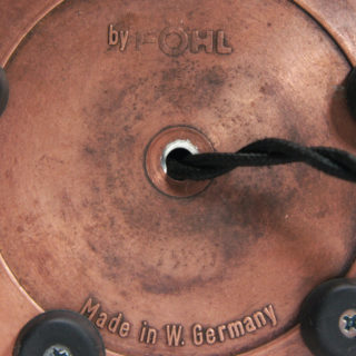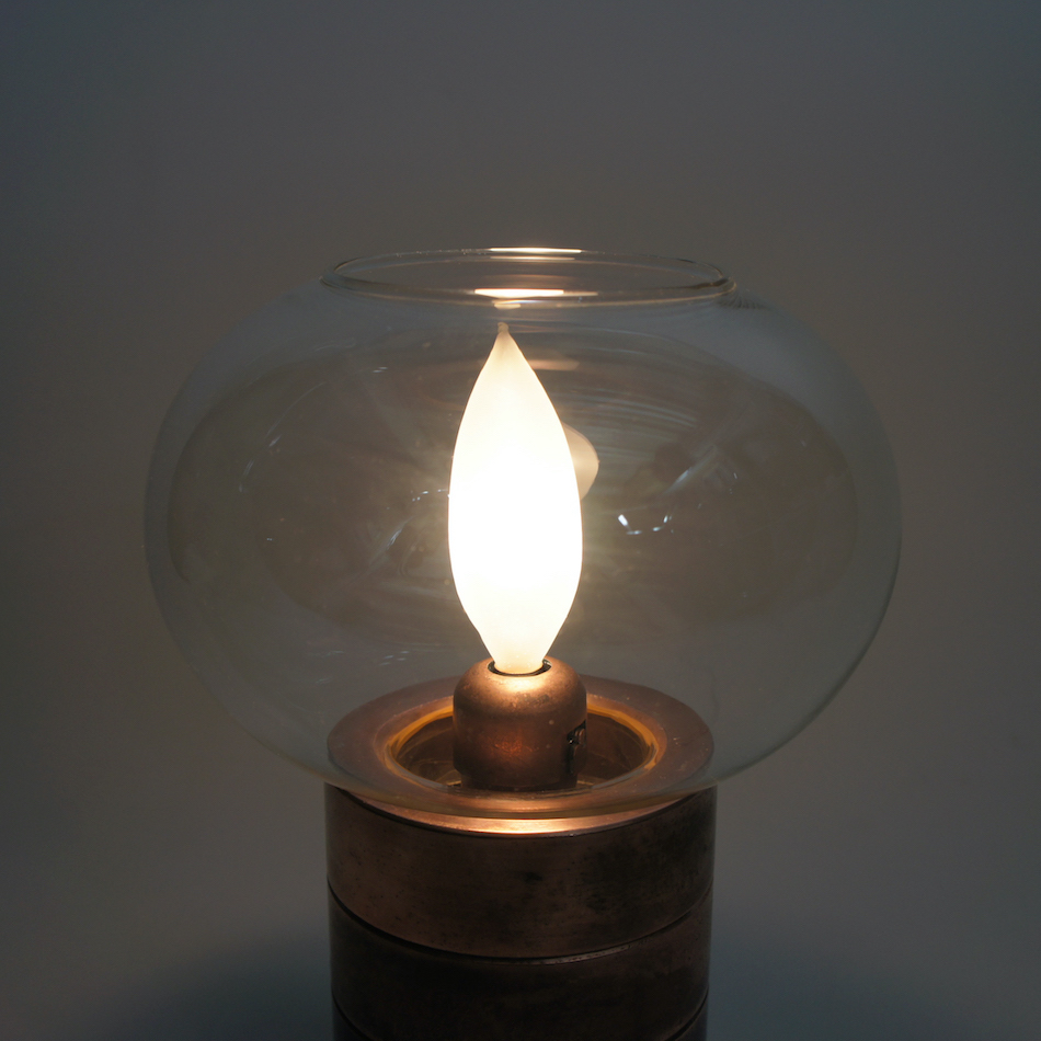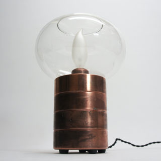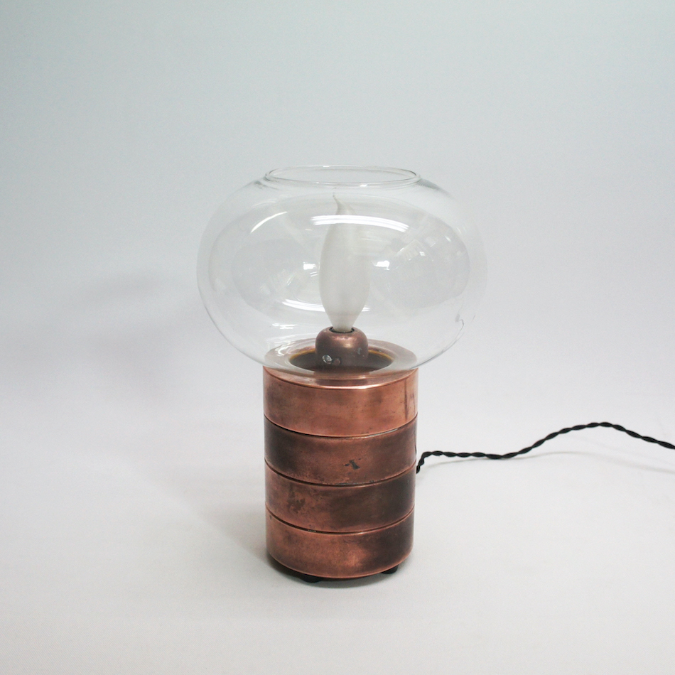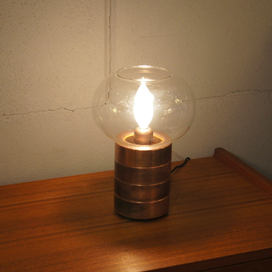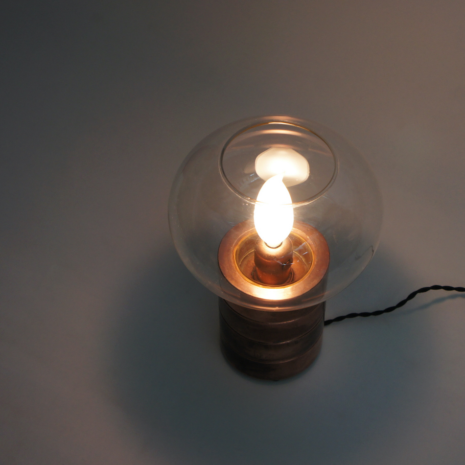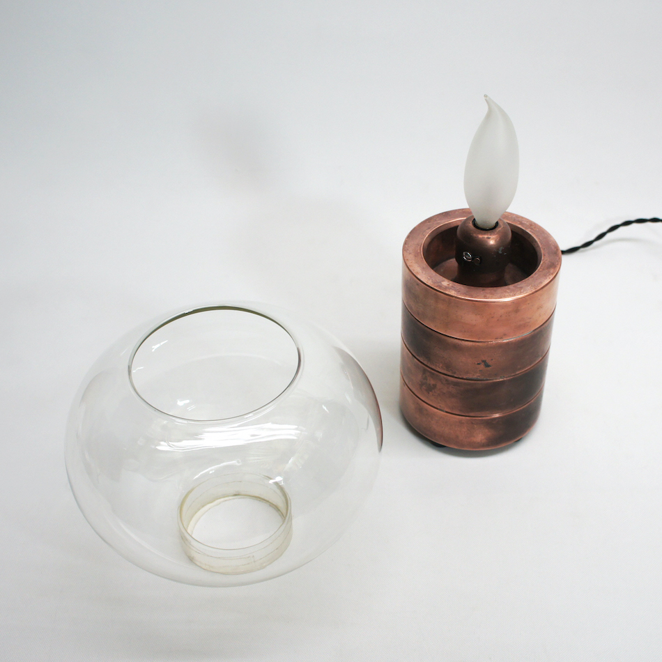 コッパー製のリングを積み重ねたベーススタンドと美しいガラスシェードを持ち、本来は中央の内部にロウソクをセットして使用するキャンドルホルダーに電装を加え、シャンデリア電球を灯すことができるようにカスタムしました。
