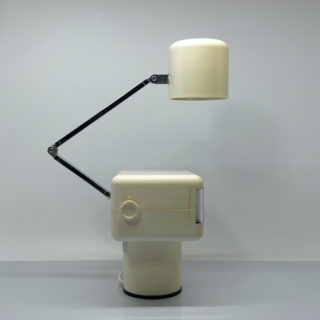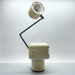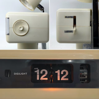 シリンダー状のベース、その上に載るボックス型のクロック本体、その後部から伸びるアーム先端のライトシェードカップを共にアイボリーホワイトのプラスティックで構成。クロックはフリップ式のデジタル表示で左側に回転するインジケーター、右側にアラームタイマー表示をレイアウト、おそらくSEIKO社のメカを搭載していると思います。スポットライトは3ヶ所の可動部をもつアームにDC12Vの電球バルブの光源を備えるポピュラーな”ナンブのクレオライト”などと同タイプの仕様、時計左側面のスイッチで明るさを2段階切り替えできます。