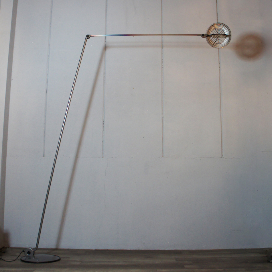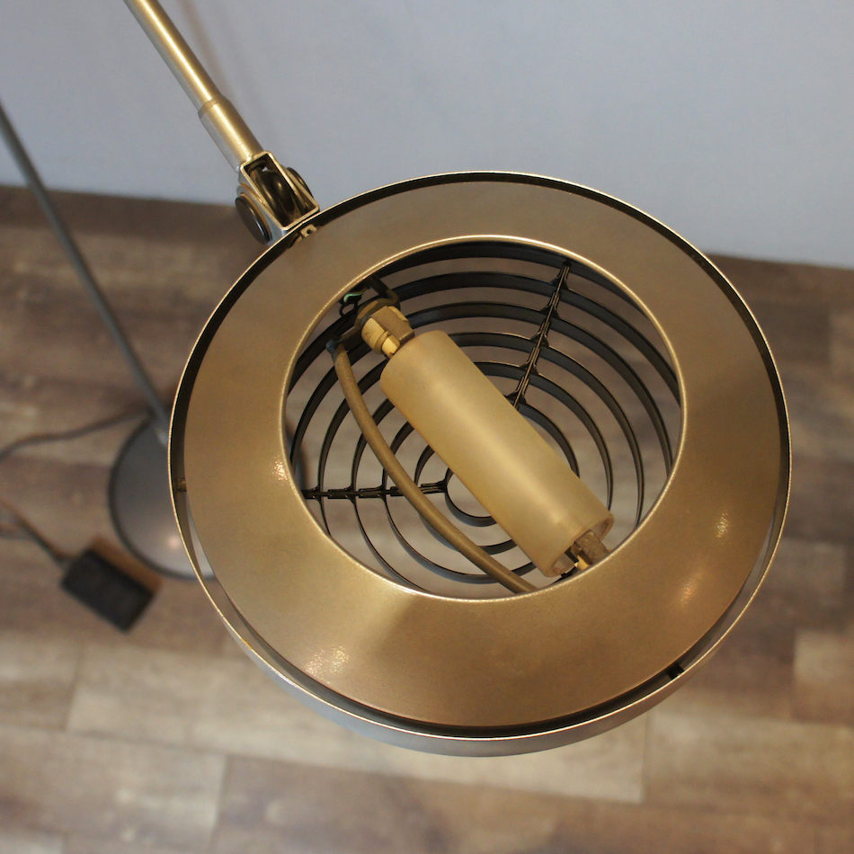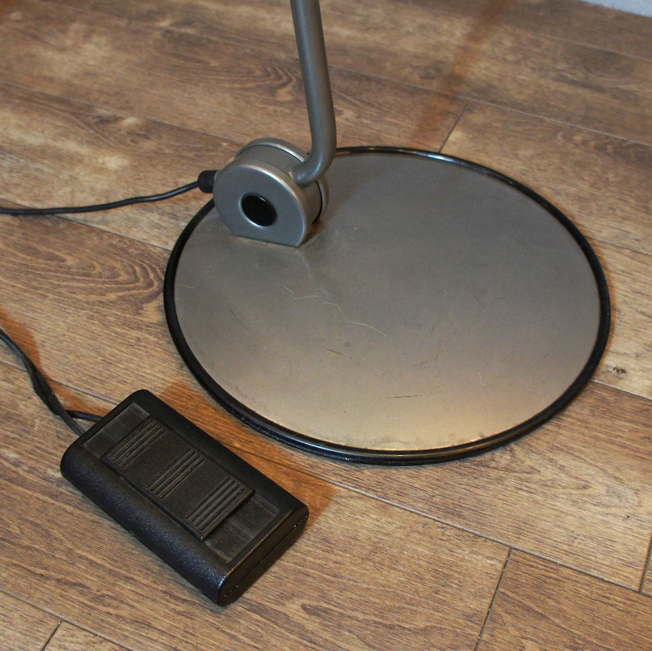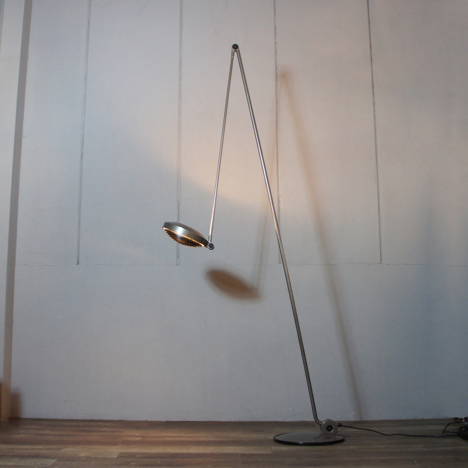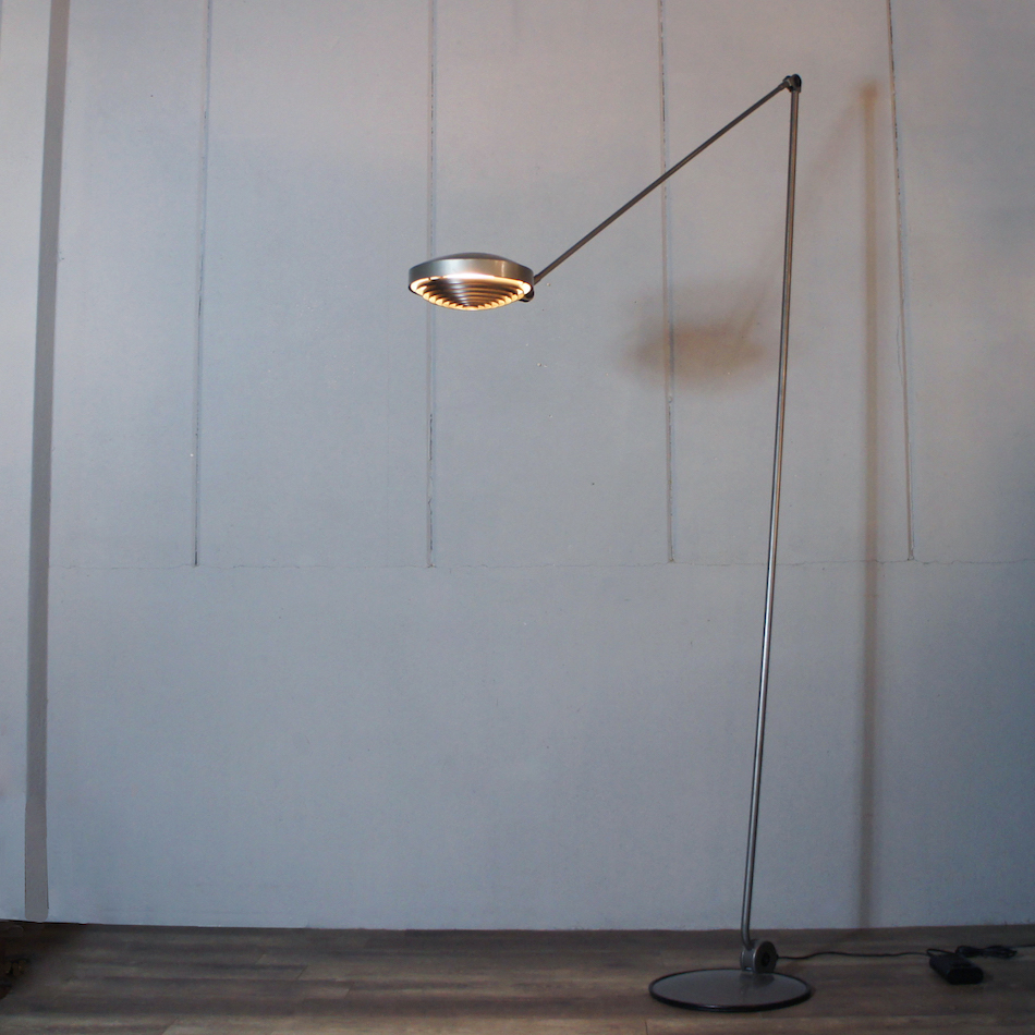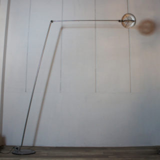 200cmのシャフトと104cmのアームの先端にルーバー状の丸いシェードを備えた驚くほどのロングトールルックス。シャフトはベースを支点に40°、アームはジョイント部を支点に270°の角度調整可能。ヘッドシェードも縦横左右方向に可動し、幅約1.8m/高さ約3.3mの広大な可動域内で驚くほど多様な照明ポジションが得られます。また、光源はコンセントコードに設けたスライドスイッチでoff〜Max200Wまで無段階に調光も可能です。
