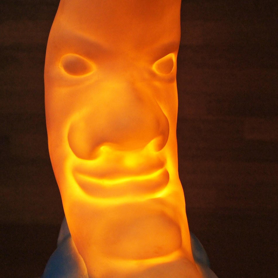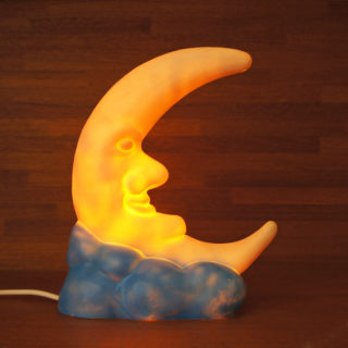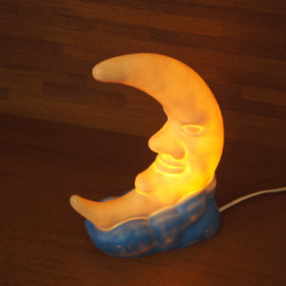 入荷の照明は、雲間からオトコの顔を持った三日月がモチーフ。レトロな雰囲気を漂わせ、青と白のみの比較的おとなしい着彩と造形ですが、それでもPVCの素材とハンドペイントの色ムラによって点灯時には怪しい光で異彩を放つ….無難にまとめたインテリア空間に満足できない人向きの、”攻め”のインテリアアクセントとなり得る照明です。