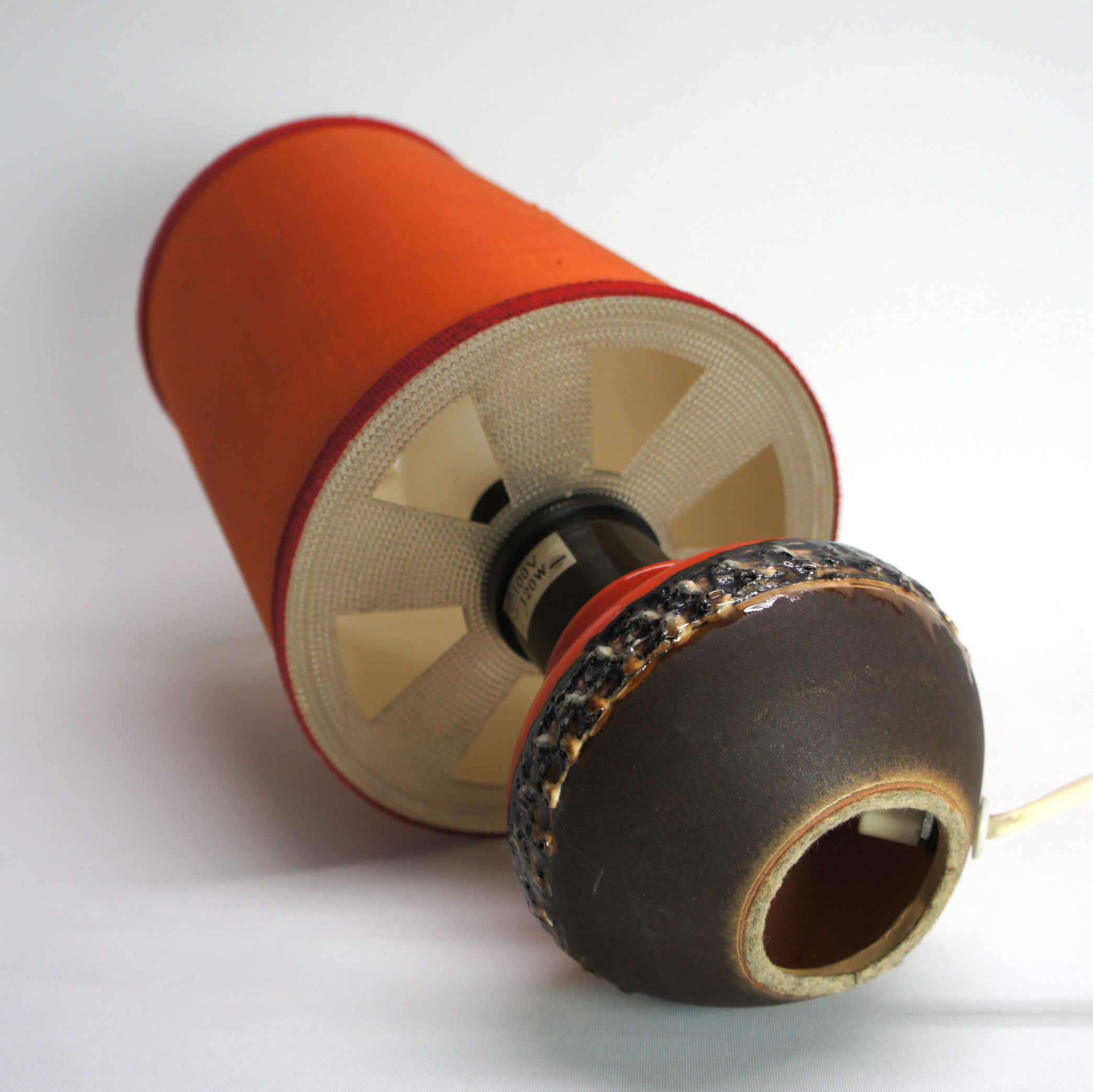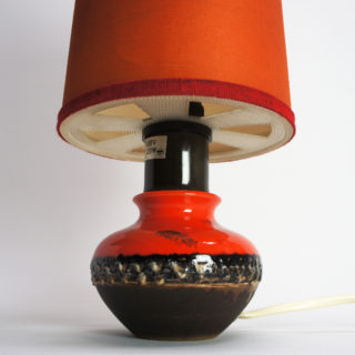 典型的なオレンジとゴツゴツした溶岩肌 (=FAT LAVA)の釉薬使いのセラミックに、オレンジファブリックのオリジナルのシェードが電球の光をほんのりとした茜色に染めて、深く暖かみのある空間を創り出します。
