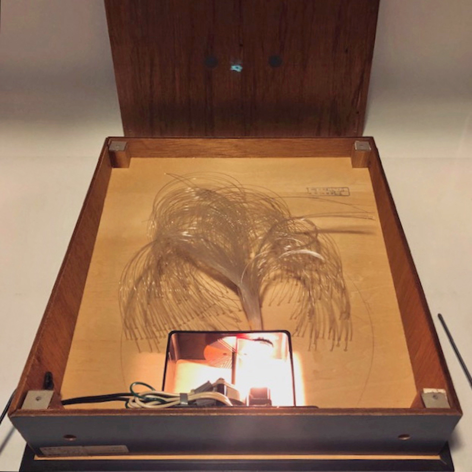 構造は、内部のモーターで回転するカラープレートを通った光がファイバーチューブの先端に様々な色の光となって伝わるアナログな仕掛けですが、数え切れないほど多数のファイバーチューブを複雑な位置に手作業で配線した相当な手間をかけて制作された製品です。<br>