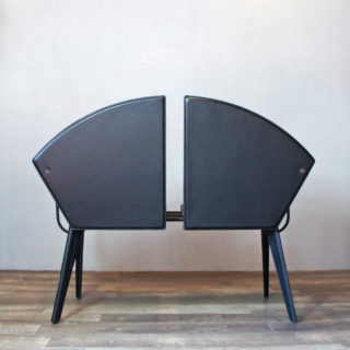 特徴的な扇型のバック、シートを中央のスリットで左右対称にセパレートした現代的なシンメトリックフォルム。