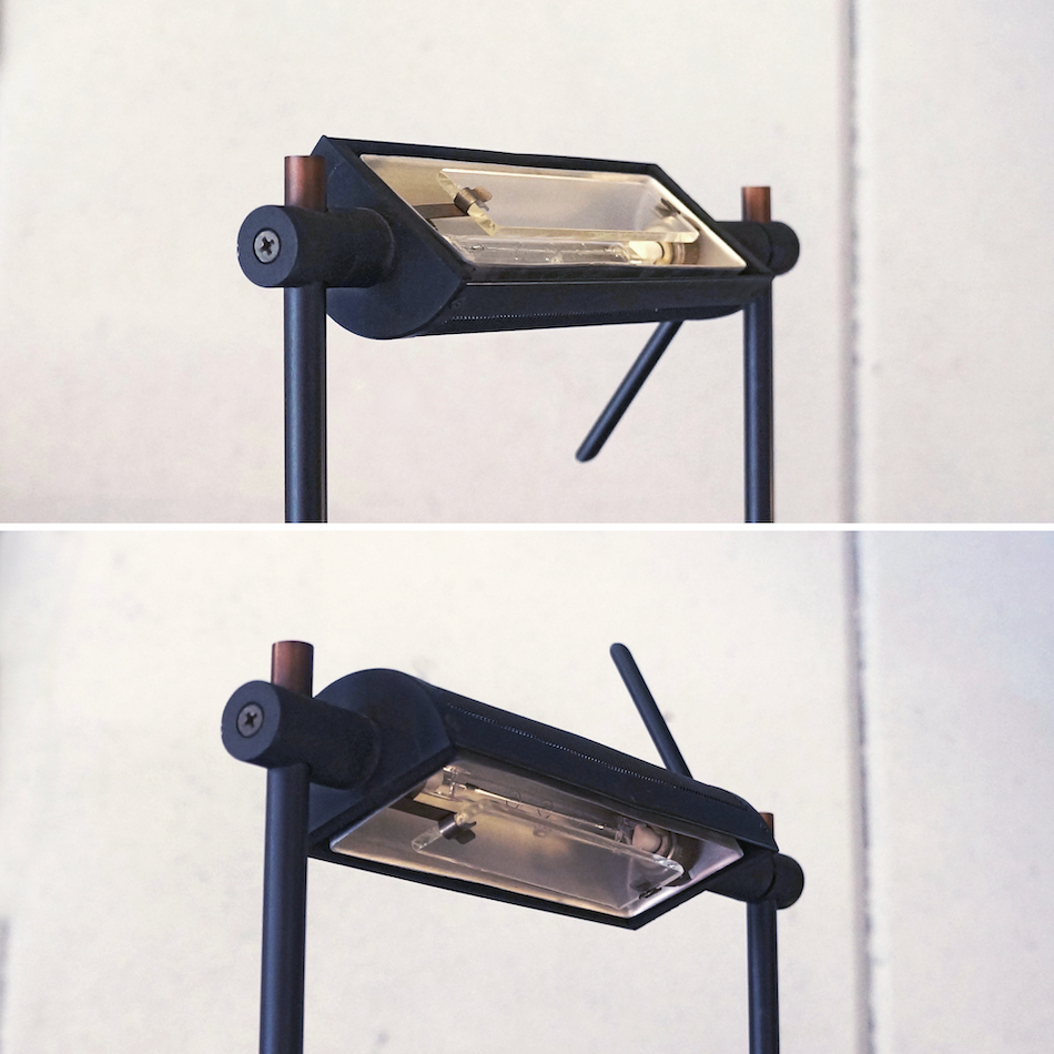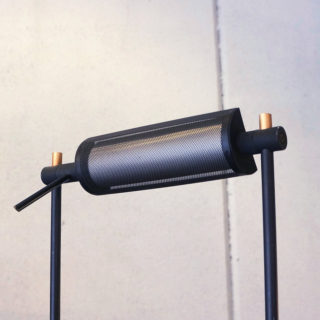 ベースから垂直に平行して伸びる細長い2本のシャフト、その上下を水平の短いシャフトが繋いだスクエアで軽快なルックス。光源も上部水平シャフトに備えたシンプルな半円柱のシェードに収まり、極めてミニマルにまとめられたデザインです。