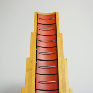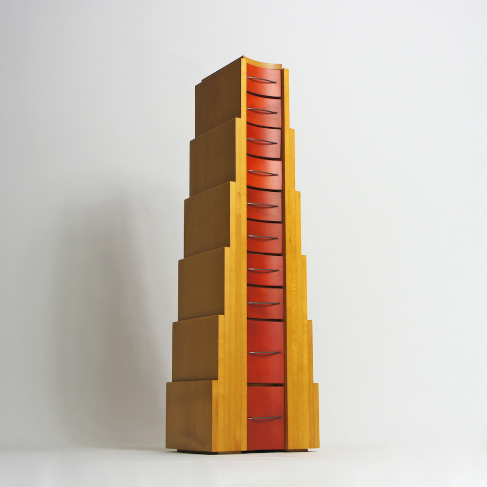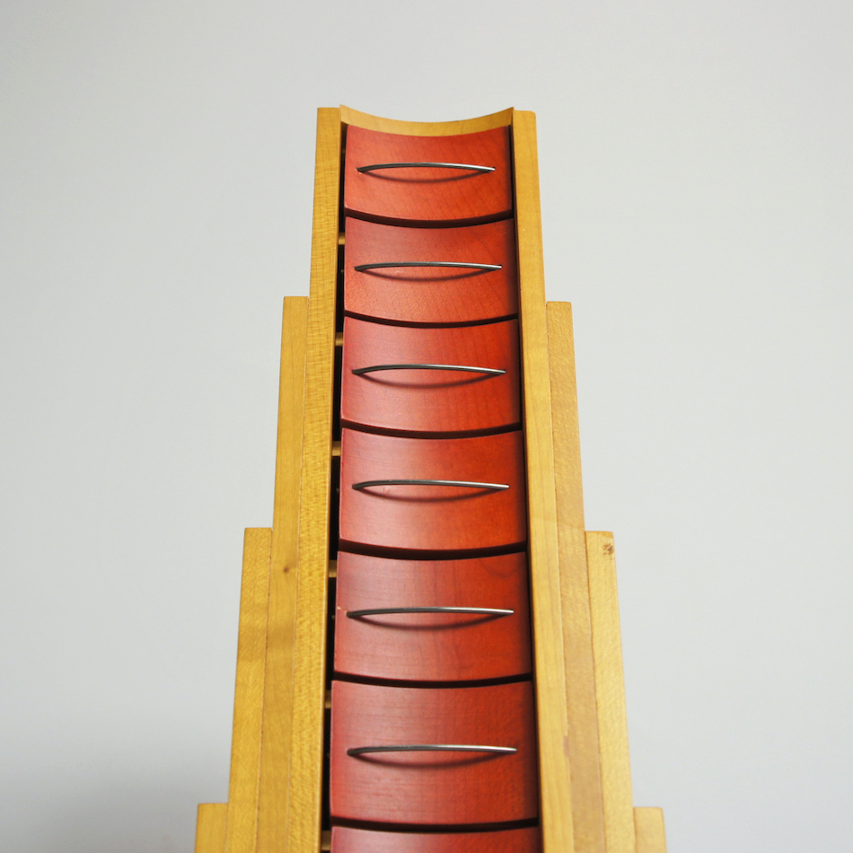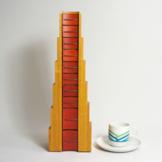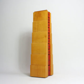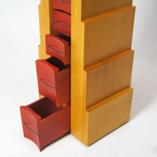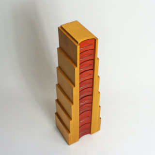 上に向かって狭まる階段状のフォルムに小さなドロワーが10段、メープルカラーとレッドの大胆なカラーリング。角張った外形とドロワー部の湾曲したフェイスと取手。計算されたデザインへの拘りと、細部にわたり精巧で緻密な造りの良さが見られます。