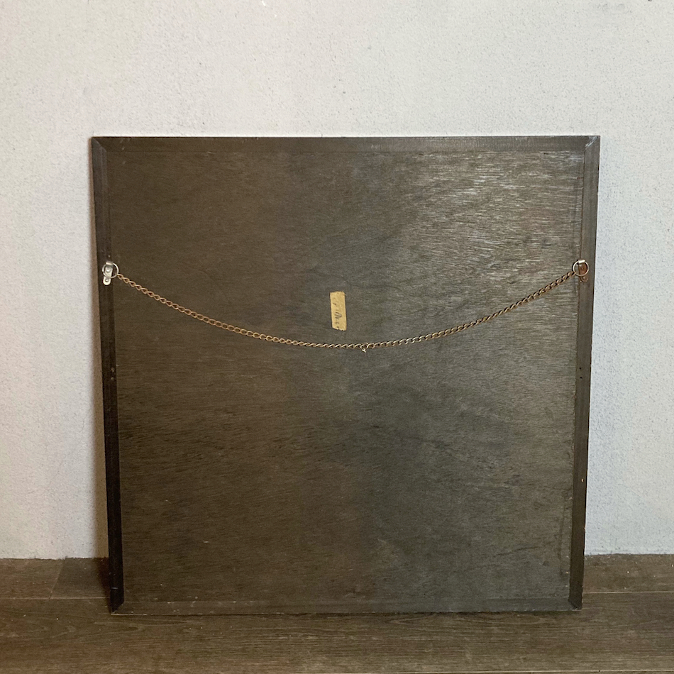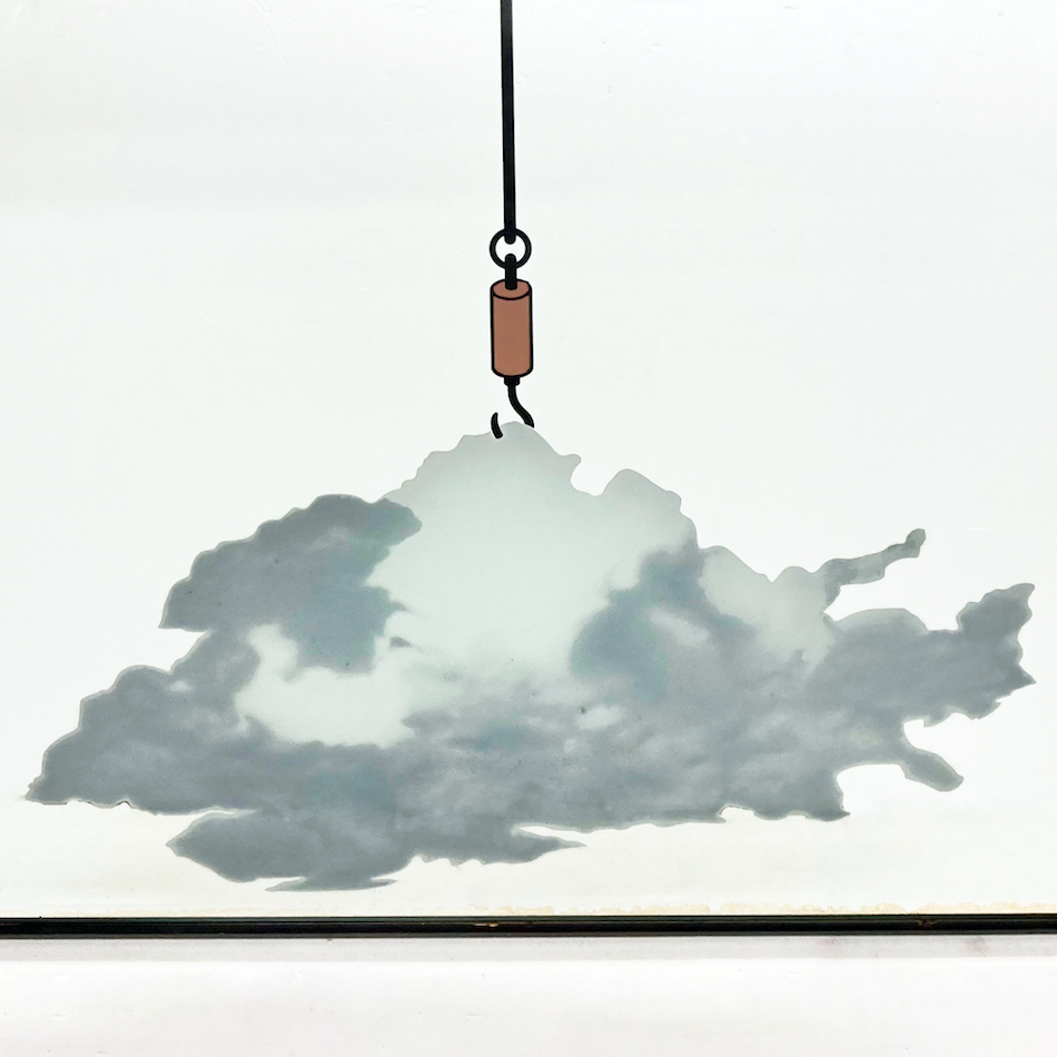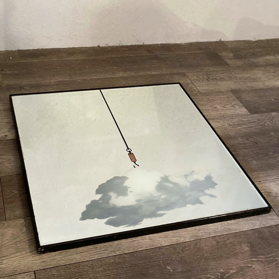 「雲のような物体がフックに吊られた」シュルレアリスム調のイラストが約60cm角の鏡面にシルクプリントされています。