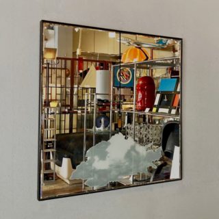 メーカーや作家は不明ですが、鏡に展開することで “ルネ・マグリット”や”マン・レイ”の作品を思わせる超現実の表現と現実の景色が鏡面に混在し不可思議な世界を映し出す、アートともインテリアとも捉えきれない両面を兼ね備えたユニークなウォールミラーです。