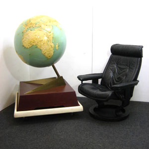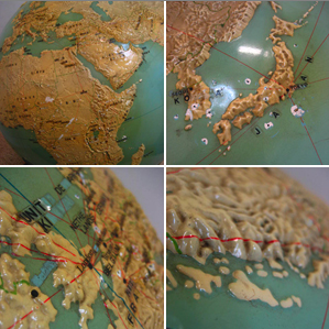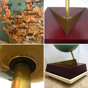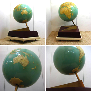 直径70cmの球体の素材の芯にはFRPを使用。航空路線や中心線が描かれ、各国の地図、山脈は凹凸の3Dエンボス加工を施し、世界を忠実に再現。本体をしっかりと支える直線的なデザインのベースは真鍮とローズウッドを使用。ハンドメイドでしか製作出来ない特注品。360°回転式。キャスター付き。